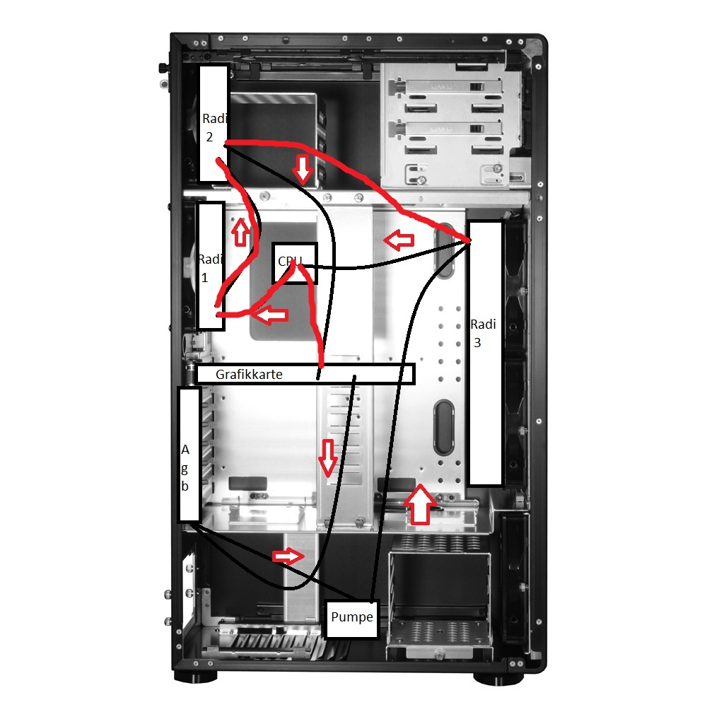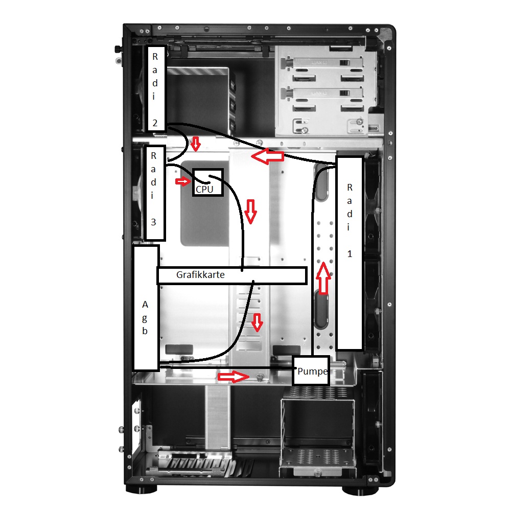 Wie zu sehen ist pumpt die Pumpe erst durch die Grafikkarte, dann durch zwei 140x140mm Radiatoren und dann durch die CPU. Dann geht es weiter in den dritten 280x140mm Radiator.