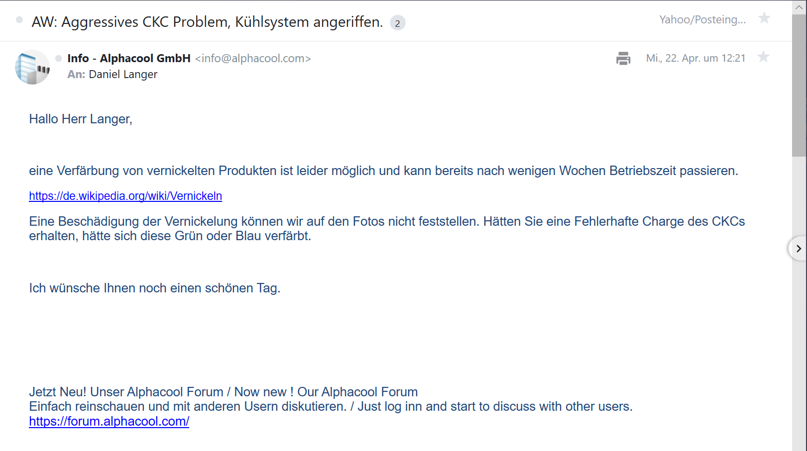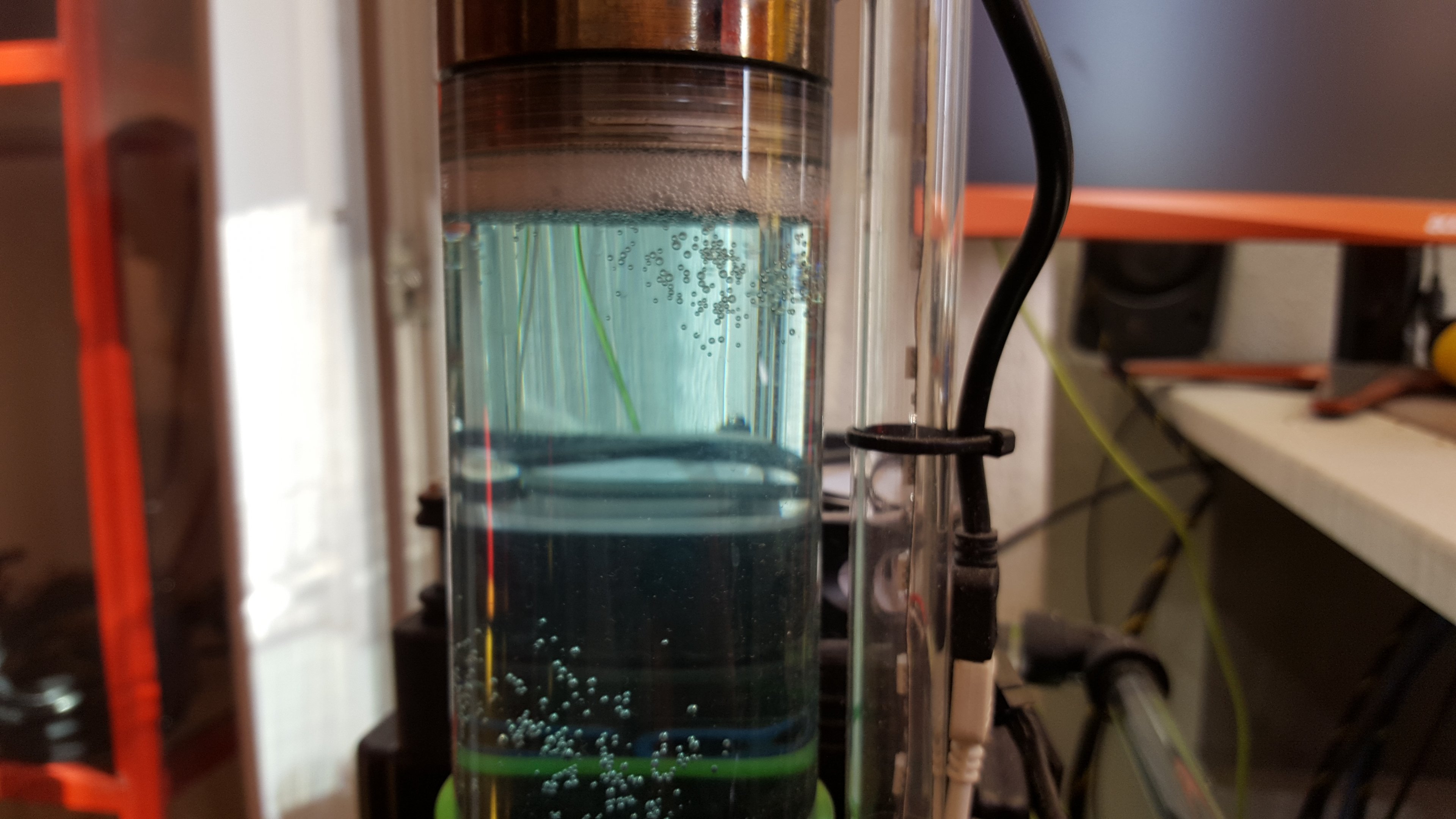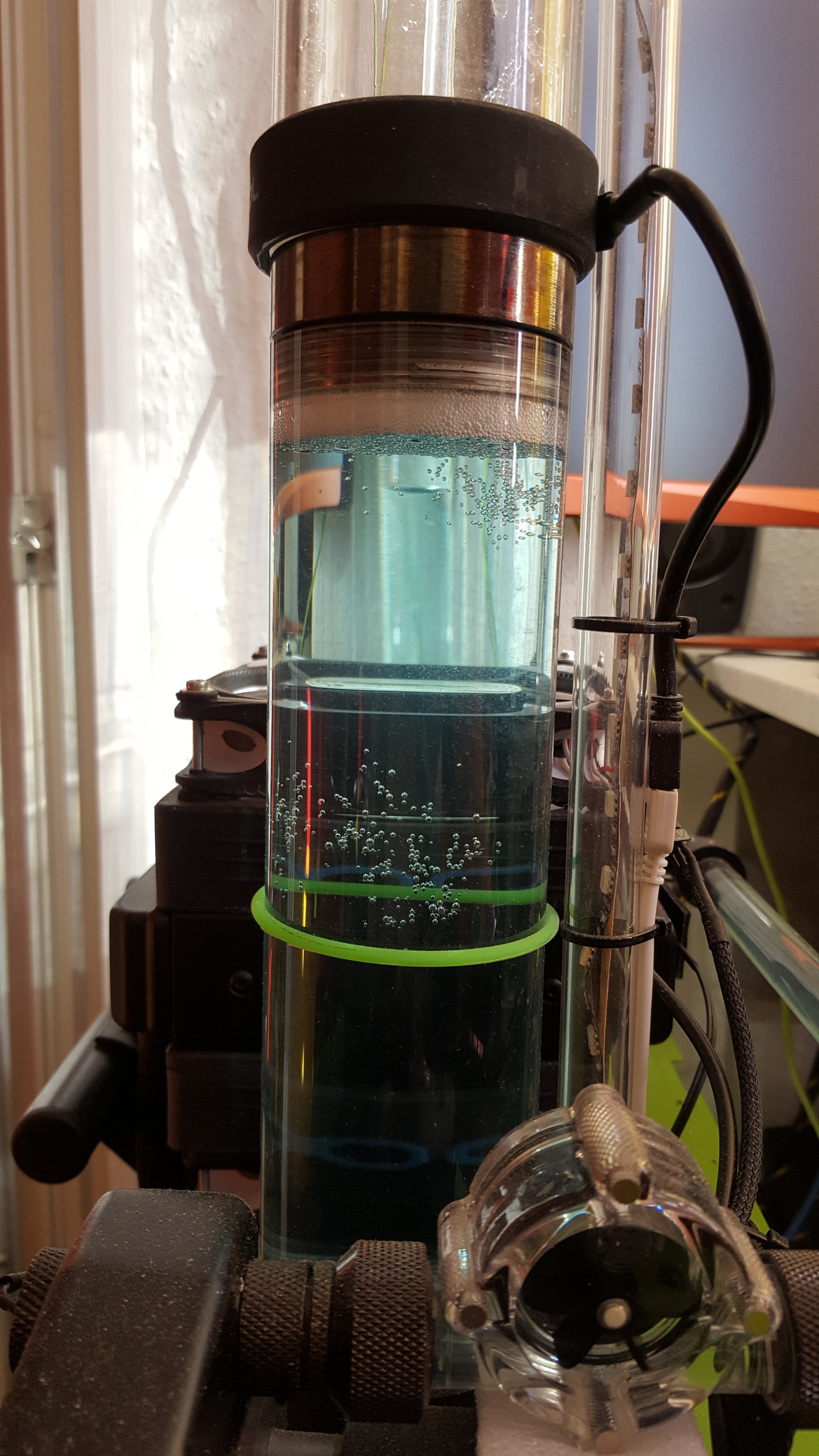 Meine Wakü läuft seit knapp einem Jahr. Jetzt ist mir aufgefallen, dass das Kühlmittel grünlich verfärbt ist. Seit wann das ist, kann ich nicht sagen, da man die Verfärbung nur unter guten Lichtverhältnissen erkennt. Hier zwei Bilder, einmal unter Blitzlicht und einmal unter Zimmerbeleuchtung: