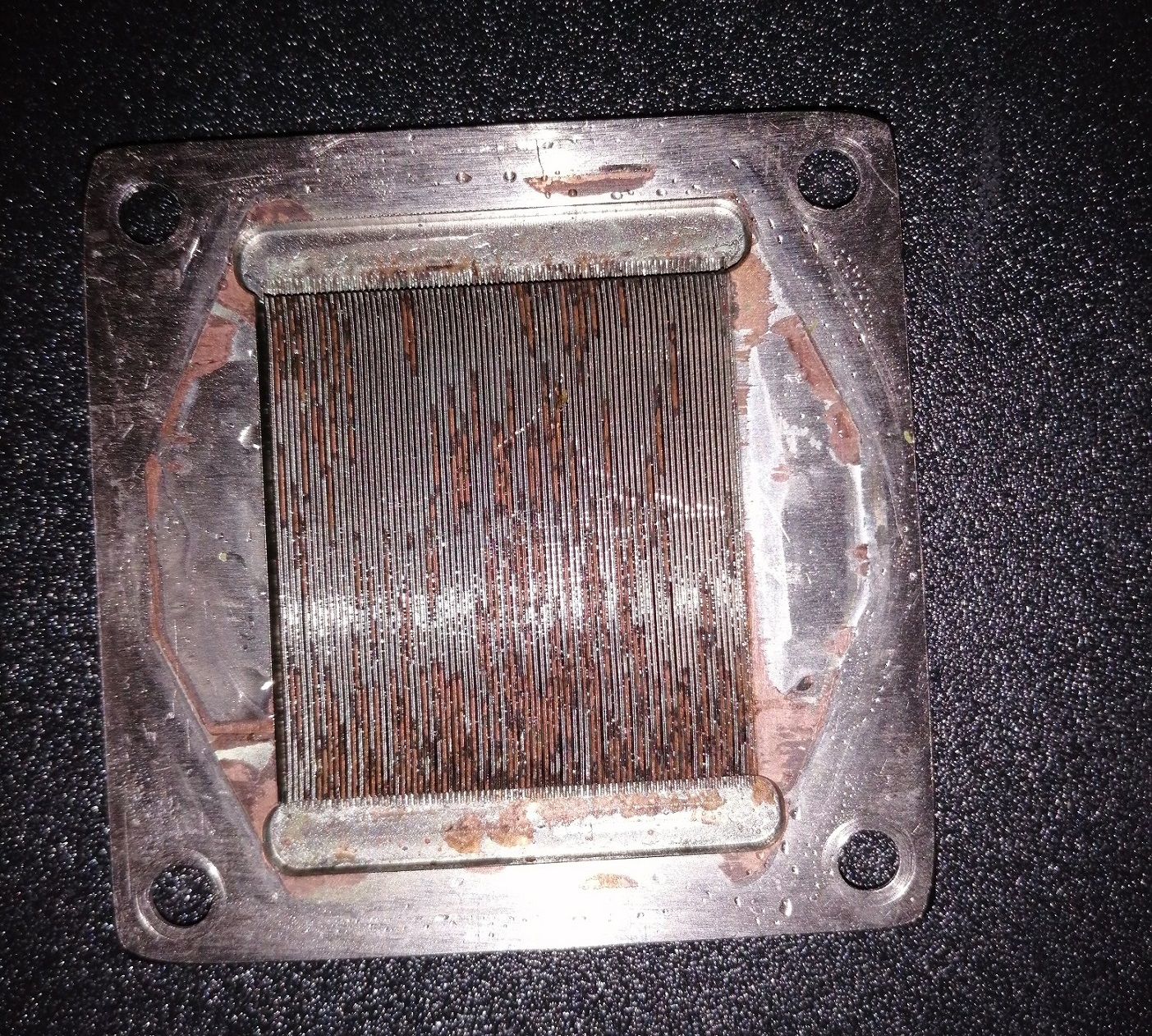 Sowohl Schlauch als auch Kühlmittel sollten transparent und farblos sein. Man sieht auch, dass sich auf der Innenseite des Schlauches Flecken gebildet haben.