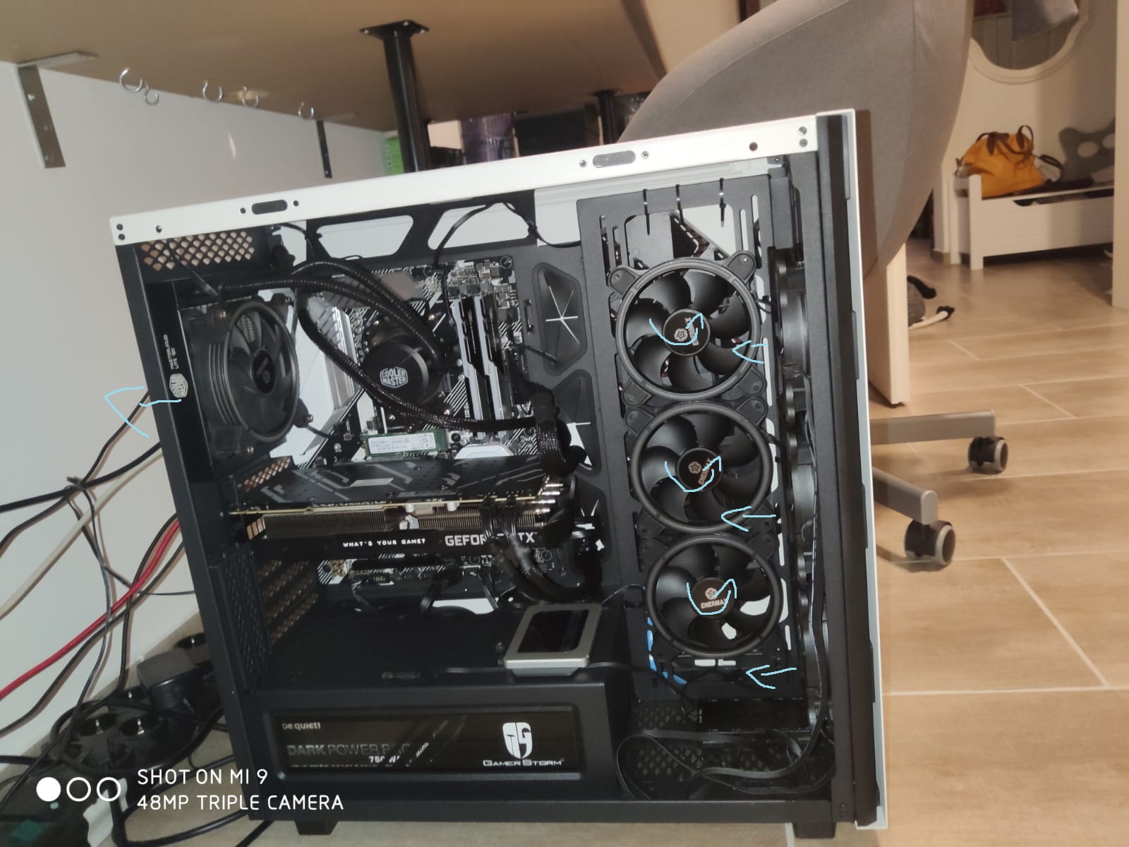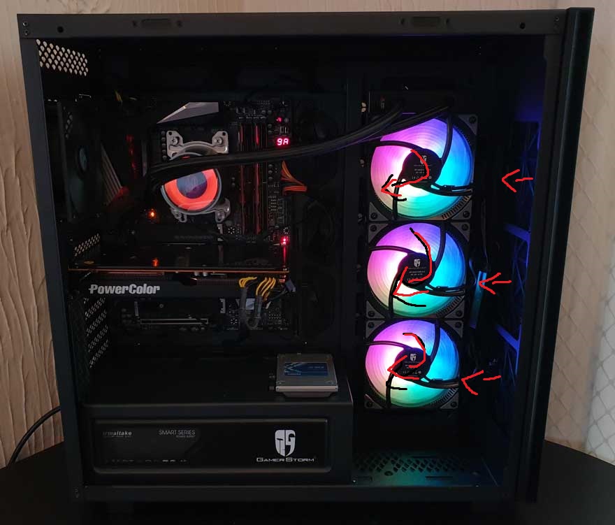 was ist denn daran zu kompliziert? die seitlichen lüfter drehen, so dass die rückseite mit den streben (die man auch bei den frontlüftern von innen sieht) nach innen zeigt.