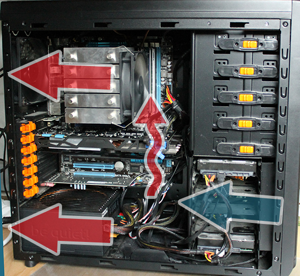 Ich hab das in dem Bild so markiert wie der Luftstrom aktuell ist. Ich habe heute einige Threads zu dem Thema gelesen, aber irgendwie bin ich immer noch unsicher, wie in diesem Fall der optimale Luftstrom aussieht. Die Grafikkarte versperrt ja den "direkten" Weg des Luftstroms. Der Kamineffekt sollte ja immer noch gut funktionieren, aber wenn ich den Effekt mit einem Lüfter extra unterstütze, weiß ich nicht, ob ich da nicht für zu viel Verwirbelung sorge. Generell habe ich gedacht, zwei langsam rotierende NoiseBlocker eLoops an den Deckel des Gehäuses zu montieren, damit diese die unten stehende Luft "absaugen". Ist dies eine gute Idee oder eher Schwachsinn?