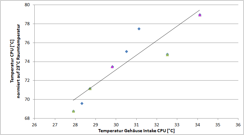 Das CPU Verhalten ist relativ simpel: „viel hilft viel“. Die Temperatur skaliert direkt mit den Gehäuselüfter Drehzahlen: