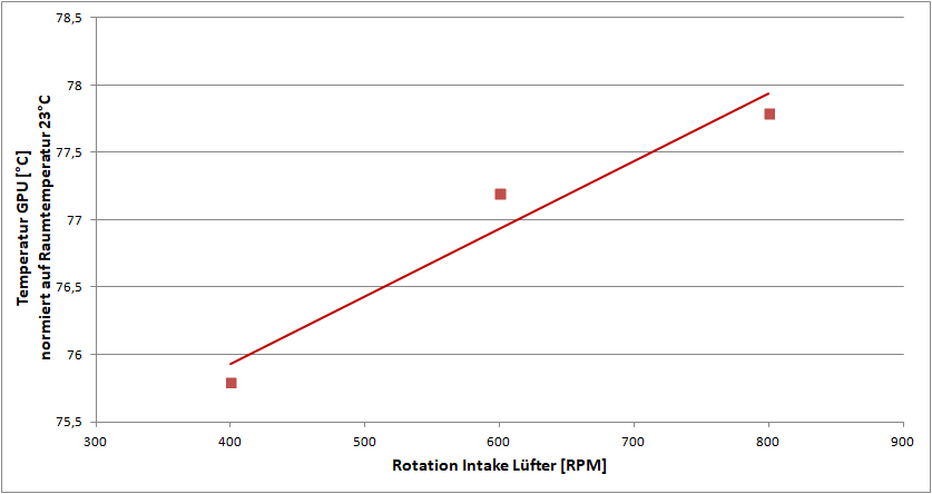 Zum GPU Verhalten durfte ich richtig viel lernen. Zunächst fangen wir mal mit den Intake Lüftern an, kurz gesagt interessiert sich die GPU nicht sonderlich für die Intake Lüfter. Ganz im Gegenteil, es gibt eine minimale Tendenz das schnellere Intake Lüfter sogar dafür sorgen das es an der GPU leicht wärmer wird, der Effekt liegt bei in etwa 1K pro 200 RPM.
