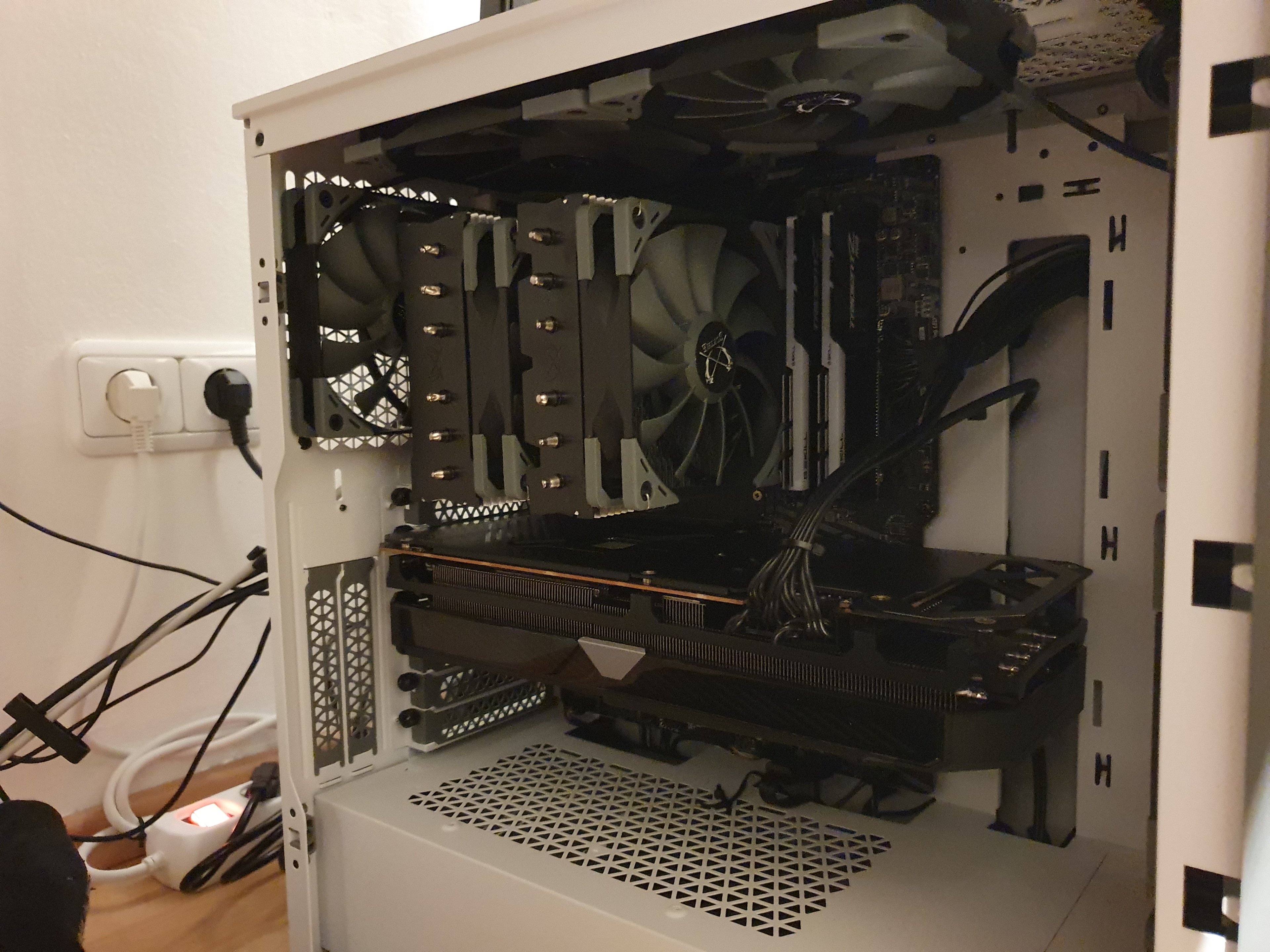 Eine Besonderheit an diesem System ist dass das Gehäuse bzgl. der Größe der GPU relativ kompakt ist. Weiterhin hat die RX6800 Strix eine gelochte Backplate sodass die GPU Lüftung direkt in den Kühlungs-Airflow der CPU bläst. Hier ein Bild der Einbausituation bei mir im Gehäuse, die GPU Abluft kreuzt sich mit den beiden oberen Intake Lüftern und so bildet sich das Luftgemischt für den CPU Kühler:
