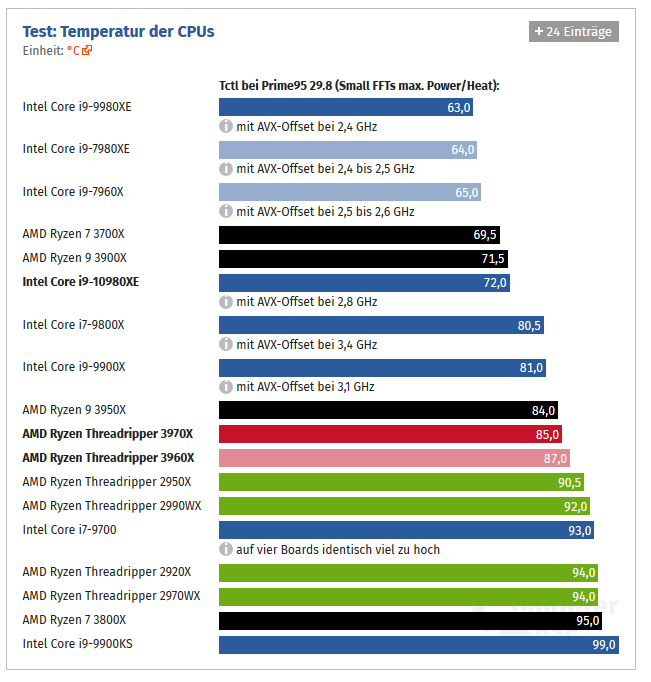 mein Arbeitspferd (siehe Signatur) setzt auf einen i9-9960X unter einem beQuiet! Dark Rock 4 auf einem Asus Prime X299-A in einem beQuiet! Pure Base 600. Zwei beQuiet Pure Wings 3 (140 mm) an der Front saugen Frischluft an, oben und hinten (auf Höhe der CPU) wird warme Luft herausbefördert. Unnötige Gehäuseinnereien wurden komplett entfernt, damit die Luft sauber fließen kann. Der obere Deckel ist offen. Die CPU läuft komplett innerhalb der vorgesehen Spezifikationen, lediglich beim Arbeitsspeicher ist das XMP-Profil aktiv. Betriebssystemseitig setze ich zumeist auf Xubuntu 18.04.
