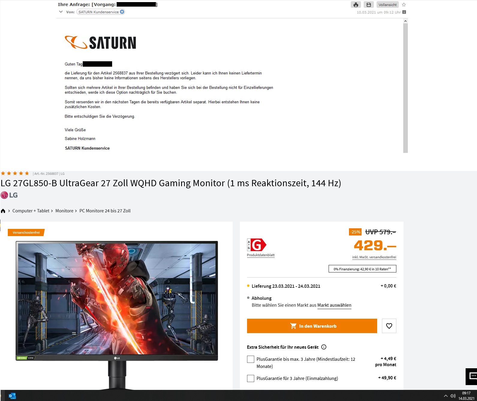 Ich bestellte am 07.02.2021 den 27GL850-B bei Saturn im Onlineshop, da dort die 19%-Aktion lief und der Monitor somit ziemlich günstig war im Vergleich zur Konkurrenz. Angegeben war als Liefertermin der 22.02.2021.