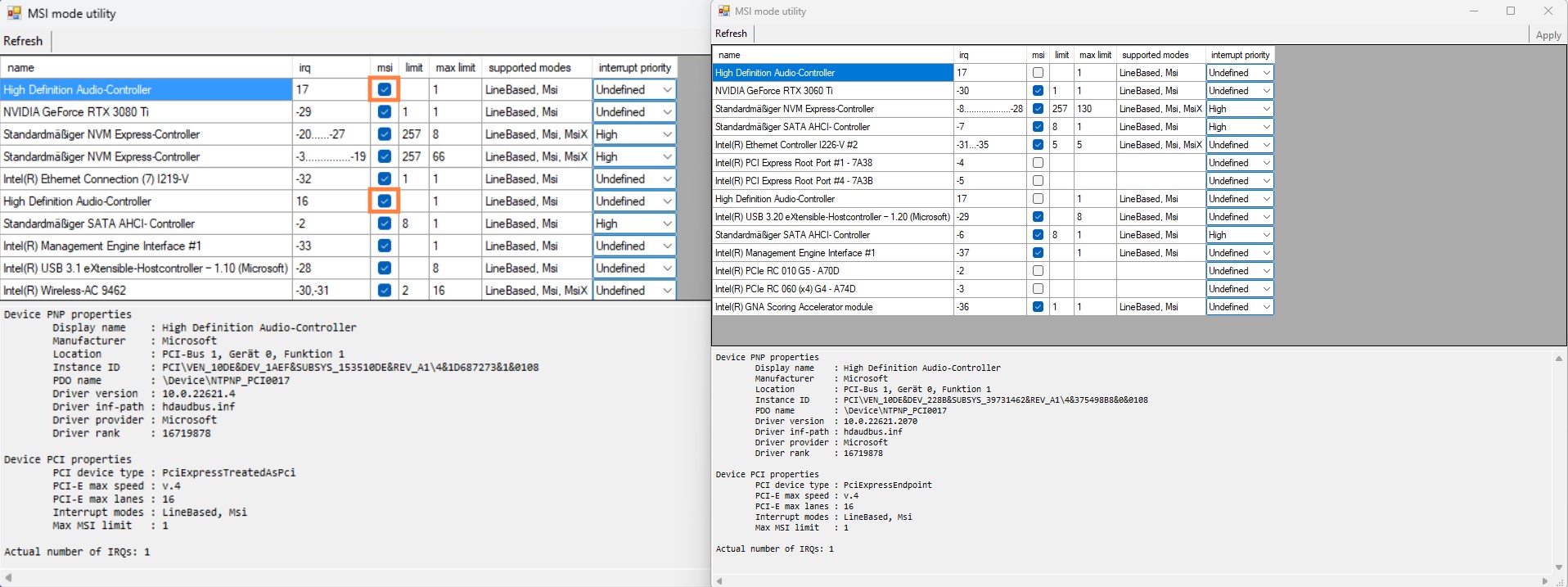 Die MSI-Häkchen bei beiden "High Definition Audio-Controller" setzen wie es in Igorslab zu sehen ist!?