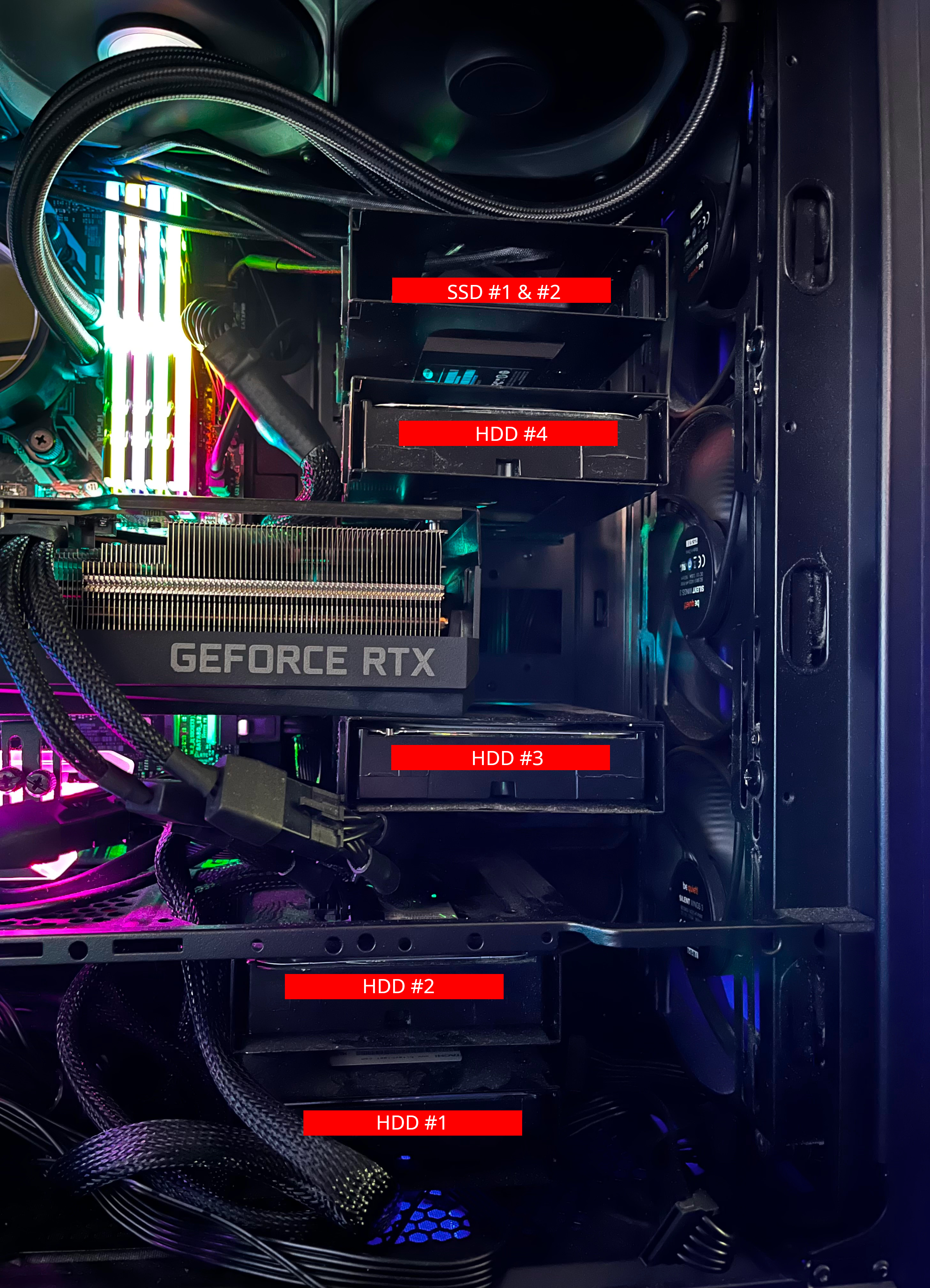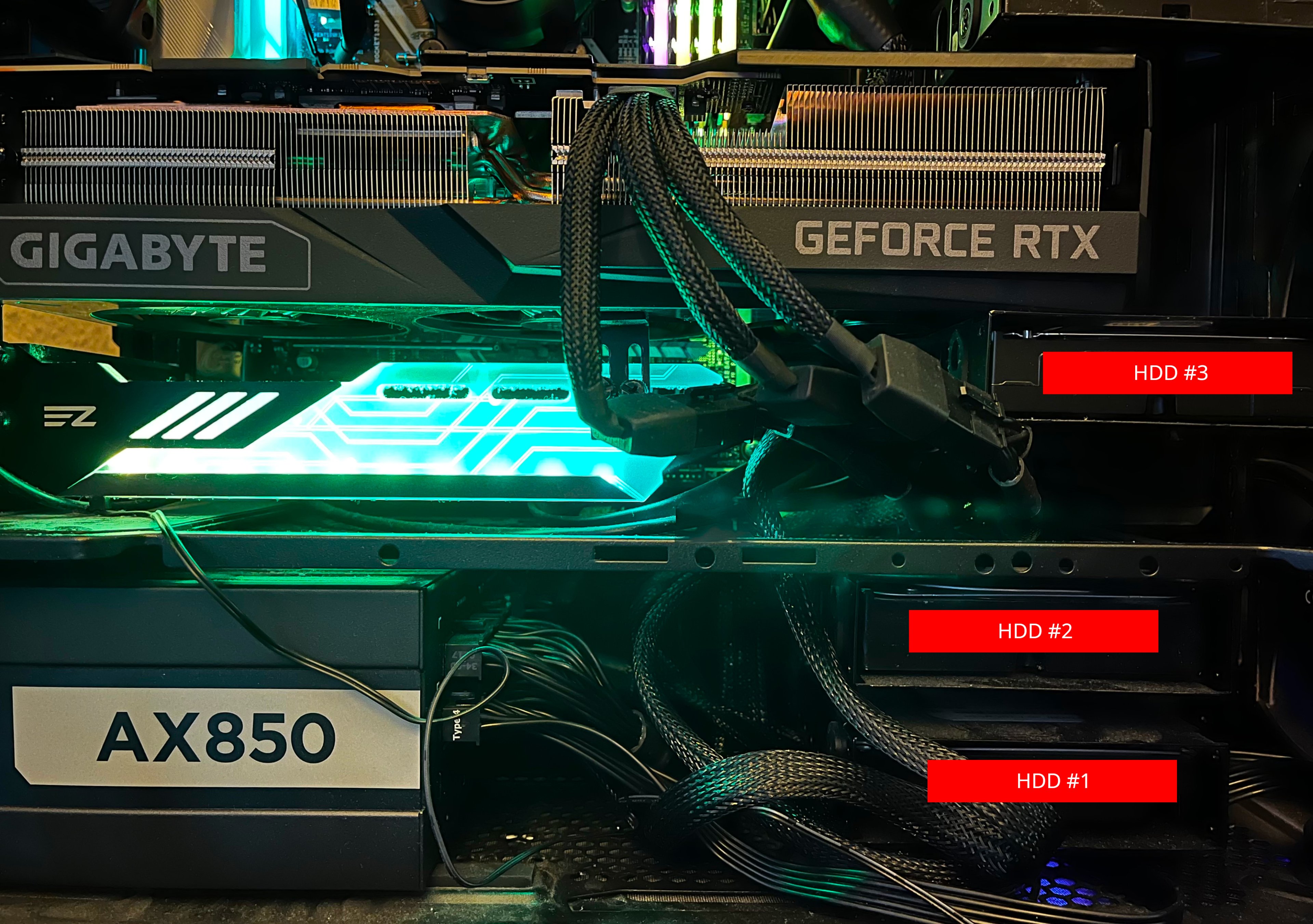 Es sei an dieser Stelle ebenfalls erwähnt, dass der Airflow in meinem be quiet! Dark Base 700 allerdings auch nur suboptimal sein kann, da ich 4 Festplatten und 2 SATA-SDDs verbaut habe und damit alle Festplattenkäfige im Einsatz sind, die bei diesem Gehäusedesign effektiv einiges an Fläche direkt hinter den 3x be quiet! Silent Wings 3 PWM, 140m Frontlüftern einnehmen.