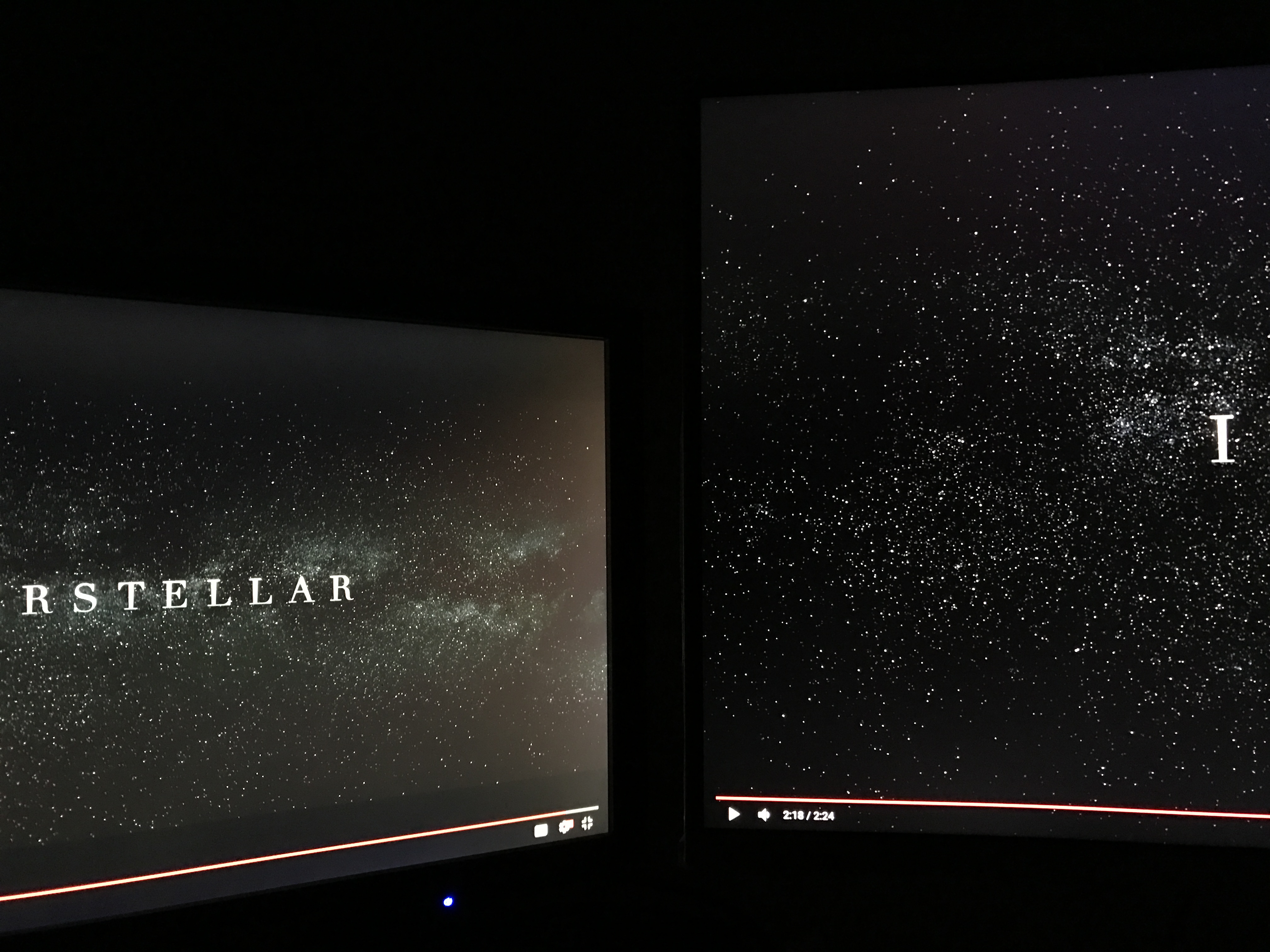 Hier ist noch ein Bild meines Acer mit IPS (Backlightbleed auf Niveau meines LG 34UC98-W) im Vergleich mit dem Samsung beim Interstellar Trailer aufgenommen mit einem iPhone 7. In Person wirkt der Schwarzwert natürlich nochmal deutlich besser aber der Unterschied ist schon gravierend. Da der LG nur 60 bzw. 75 Hz mit Freesync beherrscht und vor allem die Ecke unten links bis zur Mitte gestrahlt hat, teilweise so dass dunkle Details nicht mehr zu erkennen waren, bin ich mit dem Samsung absolut zufrieden.