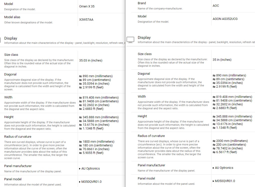 Um nochmals auf deine Frage zurückzukommen: Ich glaube das Panel im Omen ist wirklich nicht dasselbe ist wie im AOC AG352UCG, da scheint sich ein Fehler eingeschlichen zu haben auf displayspecifications.com: