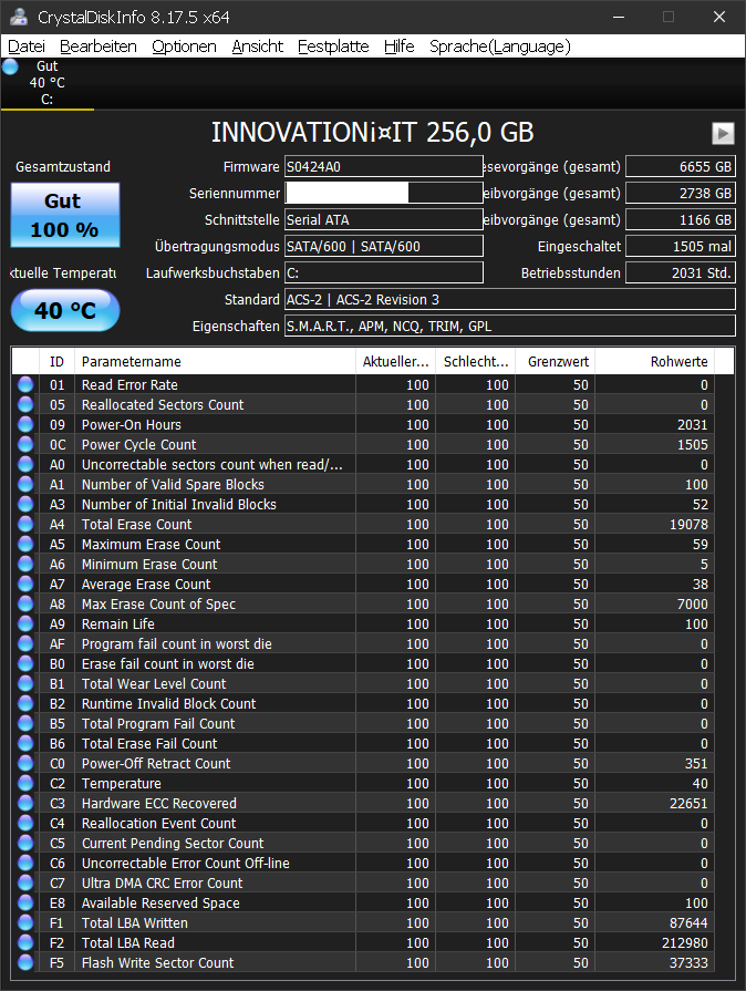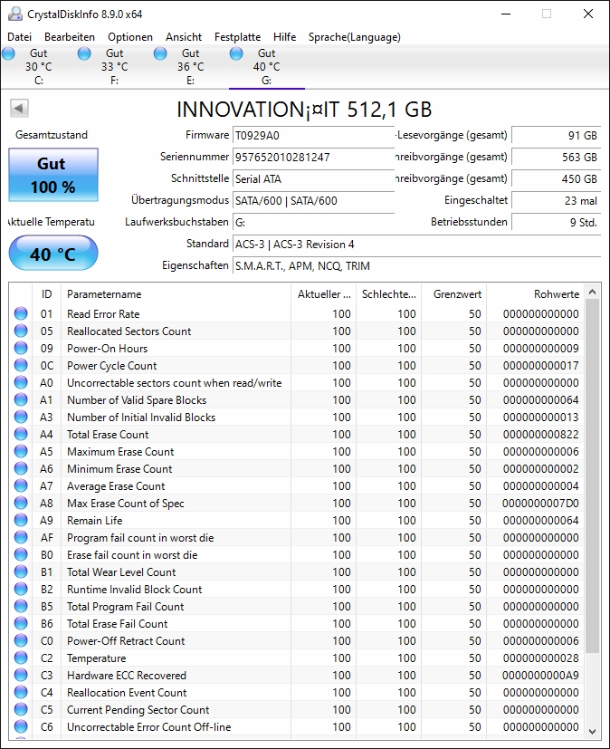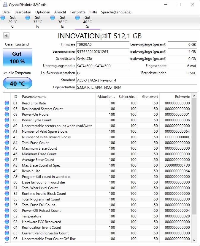 Bereits von Anfang an, wird ständig über Prüfprogramm z.B. DiskInfo die gleiche Temperatur von 40°C angezeigt. Auch alle angezeigten Smartwerte sind gleich; alle 100 - 100 - 50.