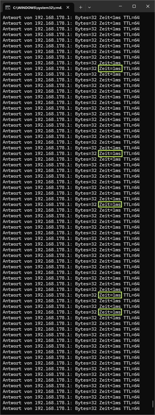 Hab auch mal bei CMD mit "ping fritz.box -t" und "ping computerbase.de -t" die Pings durchlaufen lassen. Bei beiden habe ich Zeitüberschreitungen, siehe Bild.