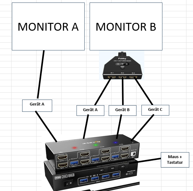 Ich würde gerne zwischen Monitor A und Monitor B die Geräte komplett frei nach Lust und Laune wechseln.