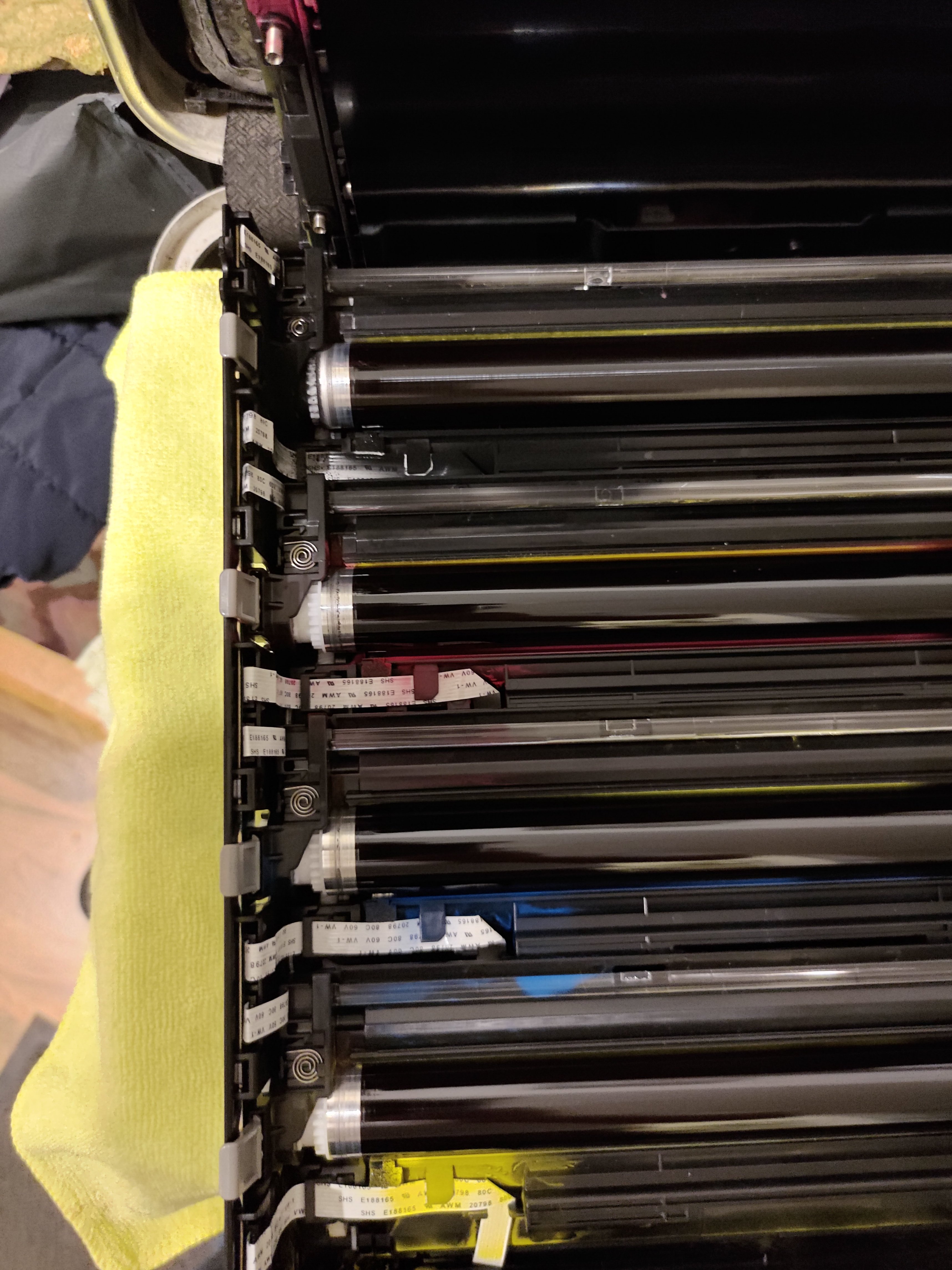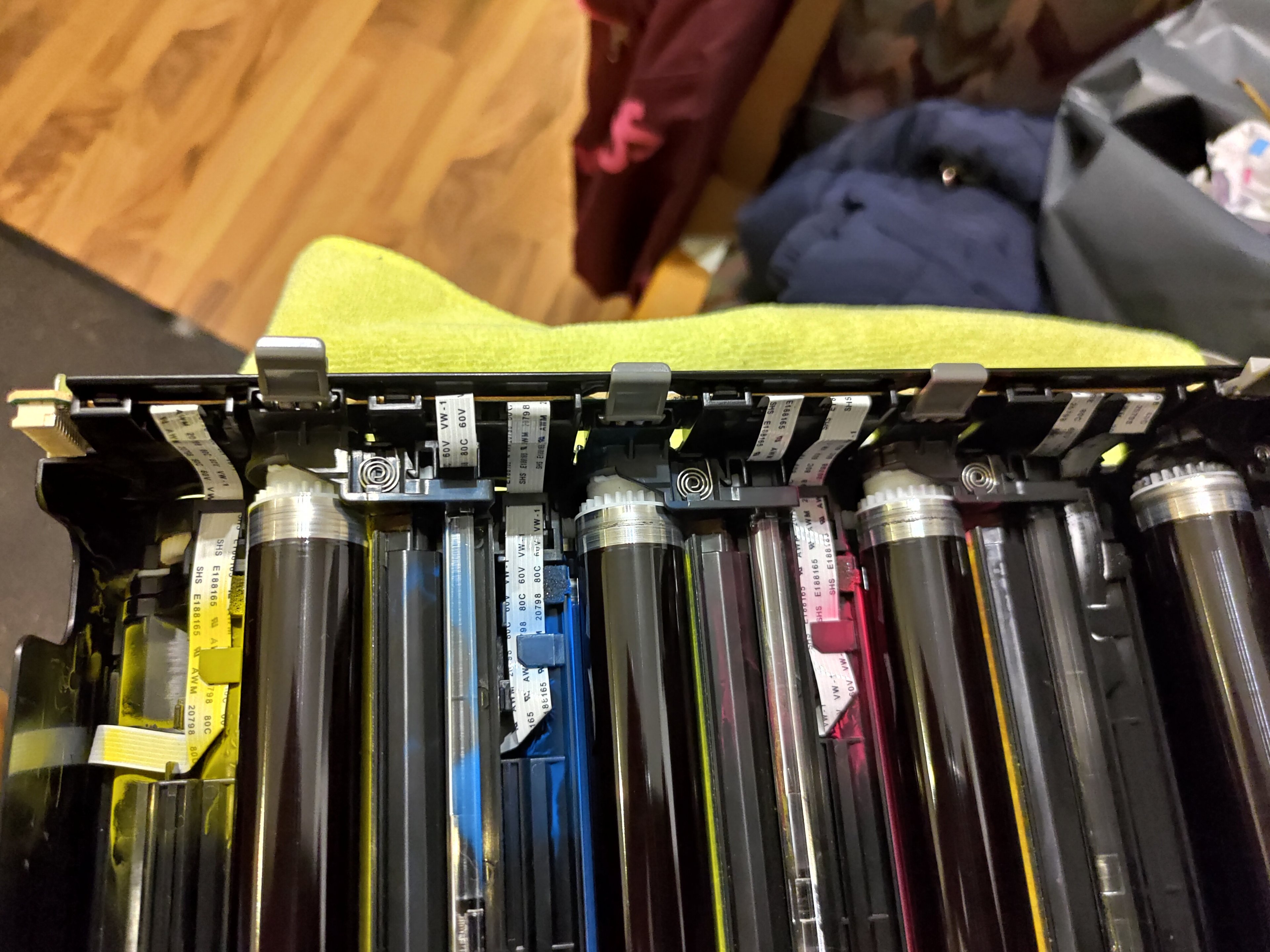Du kannst auch einen Druck starten dann den Drucker ausschalten und auf das Transferband schauen ob auf dem das Bild schon drauf ist dann wäre es ein Problem beim 2. Transfer wenn auf dem Band noch nichts ist dann liegt dort das Problem. ( keine Spannung/Kontakt)