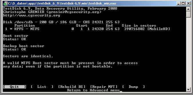 ich habe testdisk in xp laufen lassen: