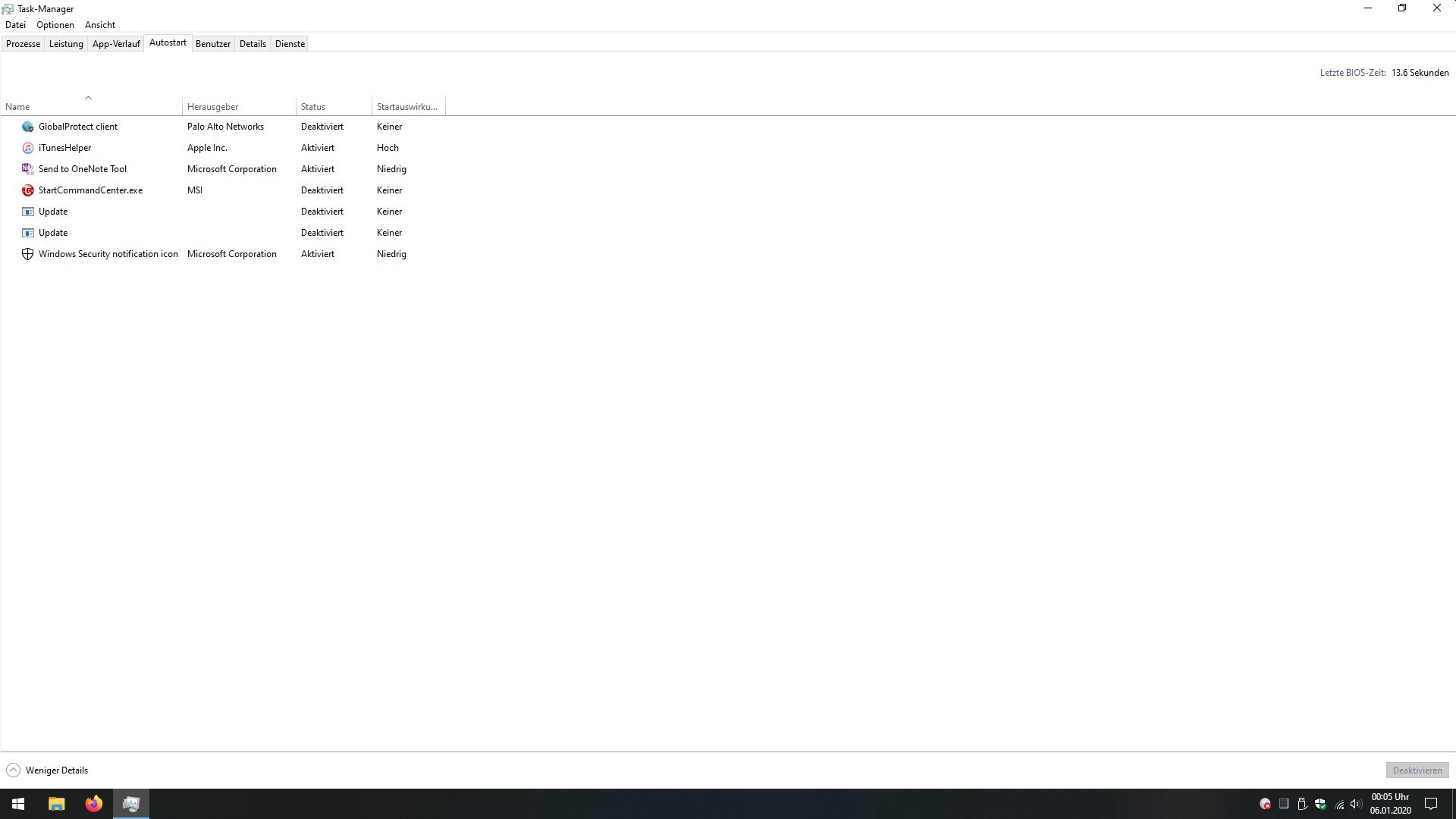 Im Taskmanager erscheint bei mir eine BIOS-Zeit von 9,8 Sekunden. So weit so gut, jedoch fällt diese Zeit am nächsten Tag auf 13,6 Sekunden ab und wie es scheint, passiert dies genau um Mitternacht.