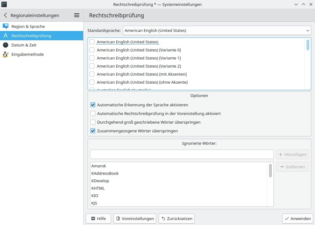 Zu 2. In den Systemeinstellungen finde ich hier nur American English, Canadian English und British Englisch - aber auch keine Möglichkeit, etwas anderes hinzuzufügen. "Region und Sprache" sind Deutsch. Ich könnte natürlich die Rechtschreibprüfung ganz deaktivieren. (EDIT: Geht nicht)