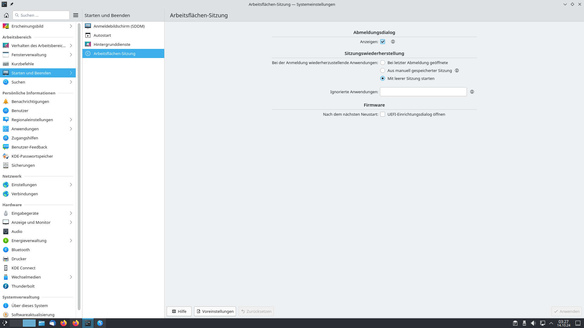 1. Wenn ich Kubuntu herunterfahre und später wieder hochfahre, versucht er, alle Fenster wieder zu öffnen, die es vor dem Herunterfahren gab. Das finde ich aber unpraktisch, ich möchte dann wieder von neuem anfangen, nur nötige Programme zu starten / Fenster zu öffnen etc. . Wo stellt man es ein?