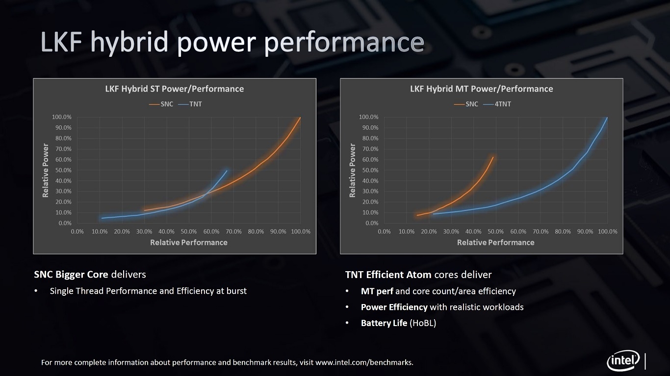 Für kleine Idle-Dinge sind die Tremont Kerne zuständig und verbrauchen dabei weniger Strom, als der Sunny Cove für dieselbe Aufgabe benötigt. Für höhere Singlethread-Leistung springt der Sunny Cove an, weil er ab einer gewissen Last effizienter und vor allem schneller wird. Bei Multithread-fähigen Aufgaben hingegen schaltet er wieder ab und Tremont zieht an ihm in Leistung und Effizienz vorbei.