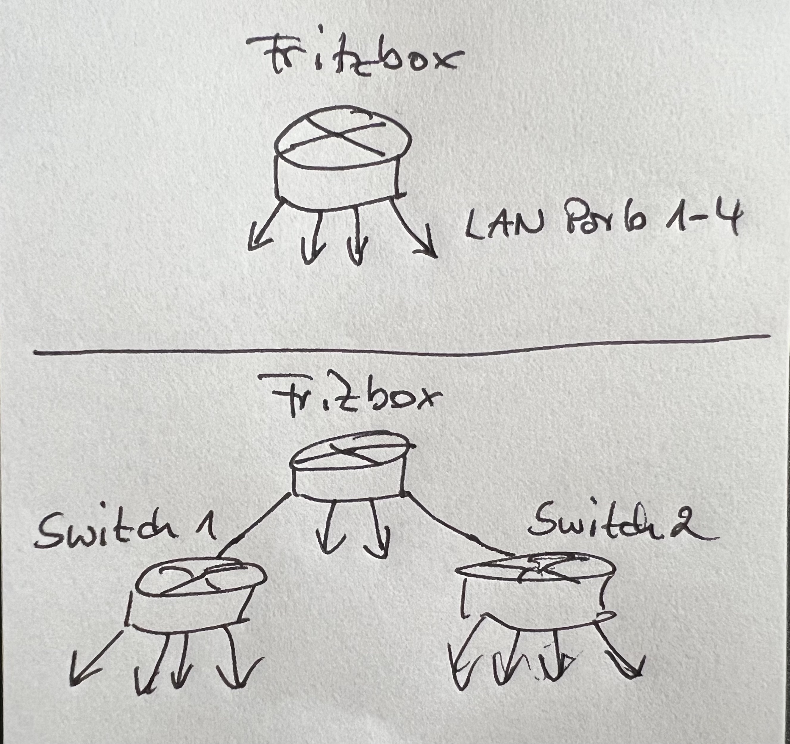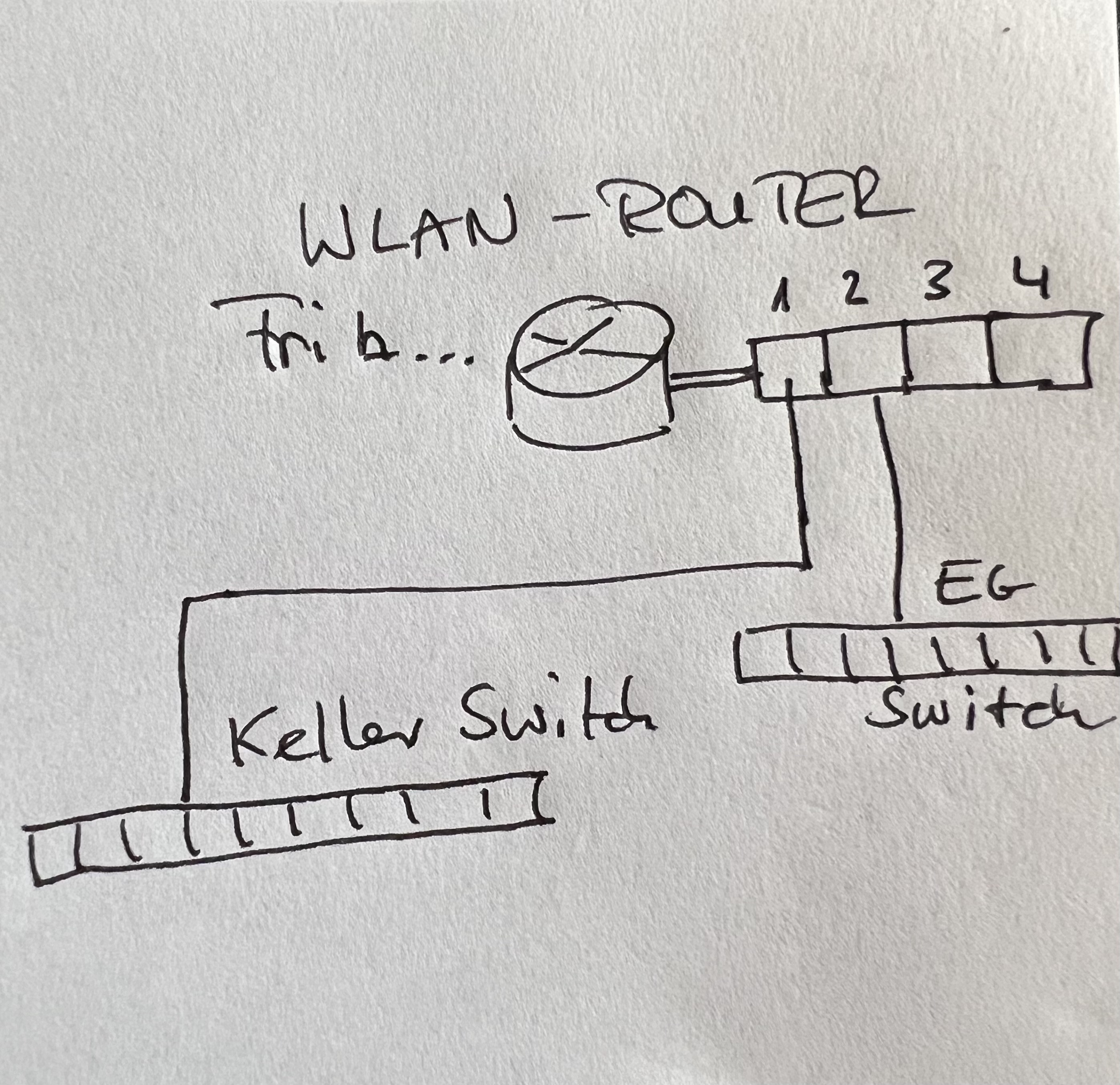 Im Wohnzimmer eine Verbindung vom Router auf die Netzwerkdose und am anderen Ende der Dose im Keller einen kleinen Switch zu hängen, so das ich dann im Keller auch ein paar freie Anschlüsse hätte.