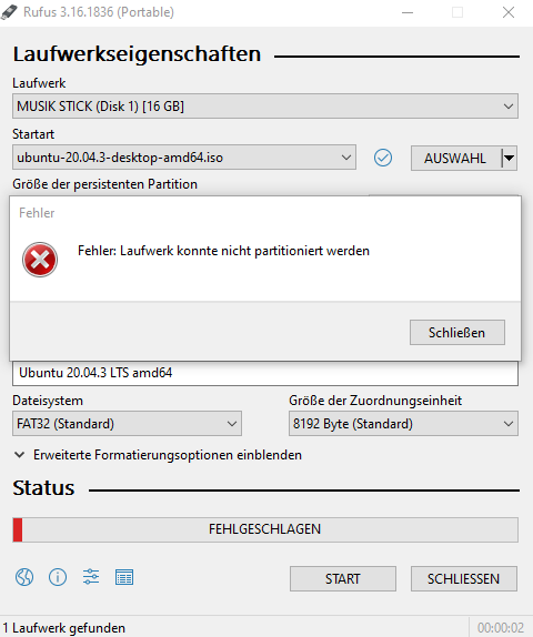 Ich habe versucht den USB Stick Bootable zu machen mit Rufus eine Software die Ubuntu selbst empfiehlt aber mein USB Stick ist ziemlich alt und ich weiß nicht ob es daran liegt das er alt ist aber er lässt sich nicht partitionieren und somit Bootable machen.