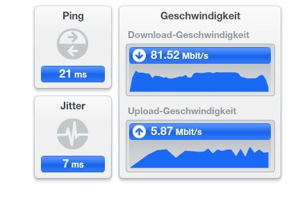 Nachtrag: Habe eben noch ein paar Tests auf anderen Seiten gemacht. Also ansteigend ist die Geschwindigkeit doch nur bei dem obigen Test. Allerdings für LAN finde ich es etwas unstabil (siehe Anhang). Ist das normal? Generell habe ich das Gefühl, dass das Internet sehr ungleichmäßig ankommt. Das ist natürlich alles etwas schwammig, ich kann es auch nur schwer greifbar machen. Am besten sieht man es vielleicht beim Speed Test von KabelVodafone. Dort läuft ja eine Kugel von "mir zum Provider" bzw. anders rum für den Downstream. Sollte diese Kugel gleichmäßig (also mit stetiger Geschwindigkeit) laufen? Bei mir springt sie nämlich ziemlich wild umher (immer ein paar Pixel nach links und rechts) oder wird mal kurz langsamer um dann plötzlich schneller nach vorne zu laufen.