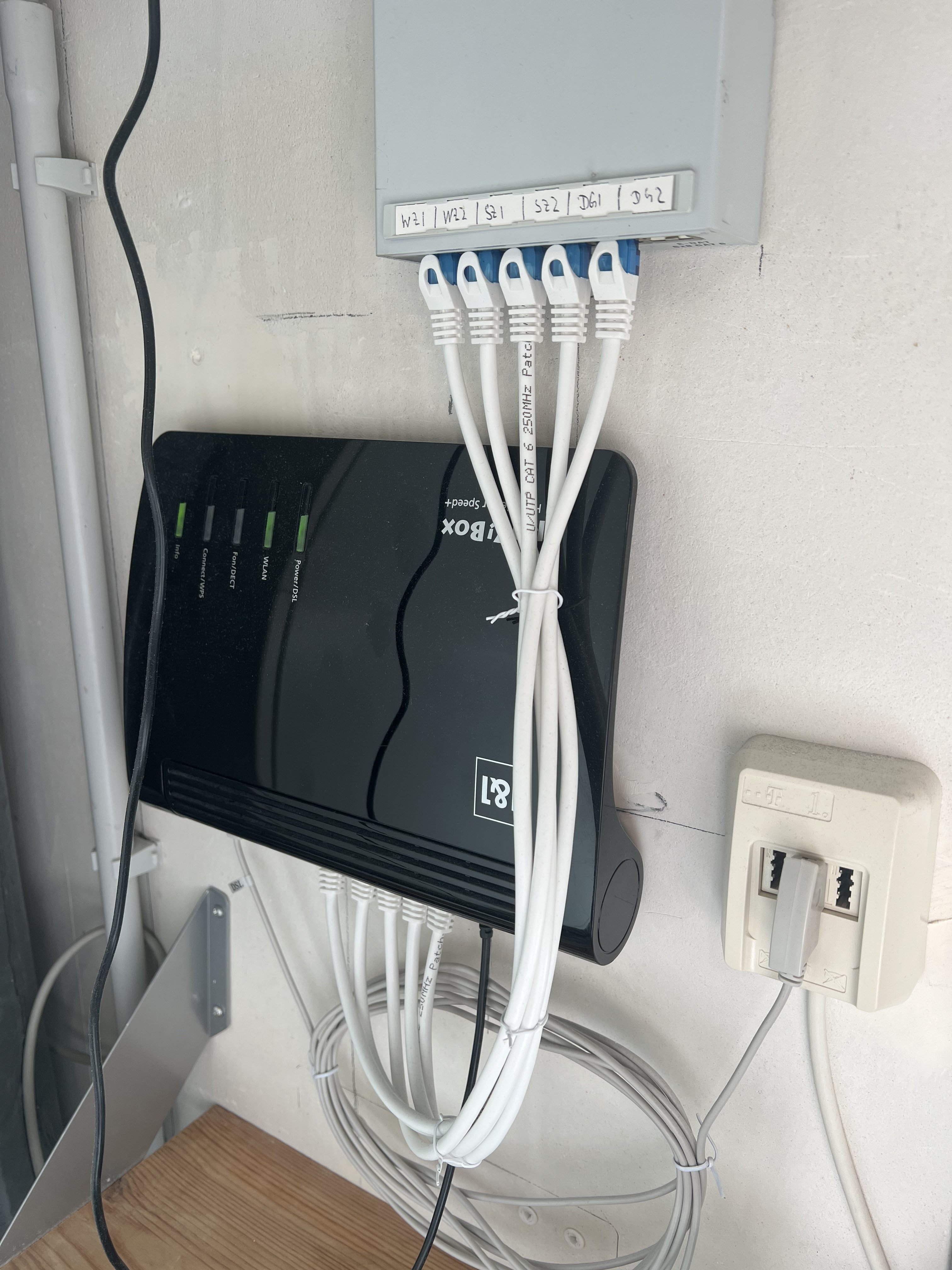 Problem: Die FritzBox erkennt nur EIN spezifisch Kabel. Dieses Kabel 3 Enden. Eins kommt in den LAN-Stecker des Routers, eins in den Verteiler und eins in den FON Anschluss des Routers (folgend Doppelkabel). Auch wenn ich die FON-Verbindung abstecke, habe ich im jeweiligen Zimmer LAN.
