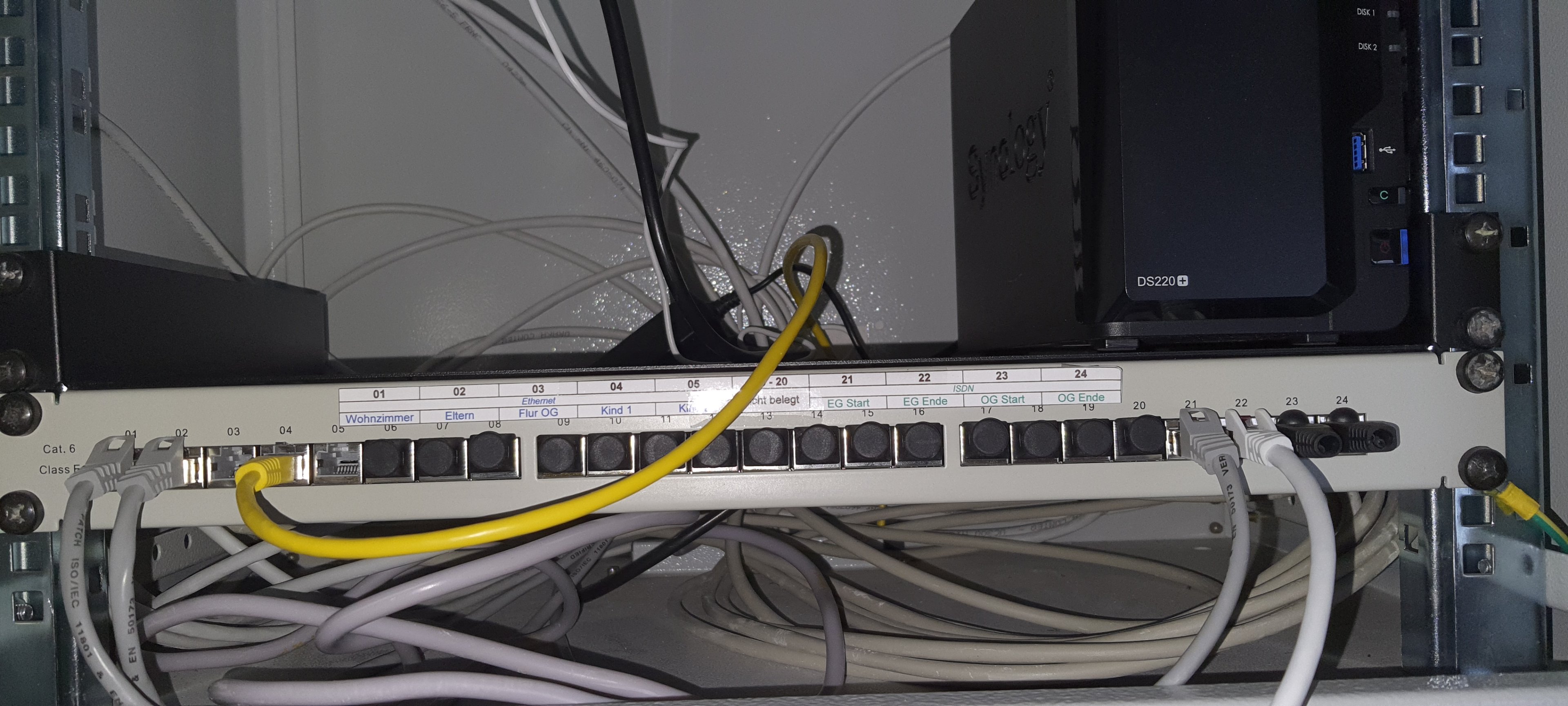 Wenn Ihr den Hub anseht, sind im linken Bereich die Ports 1-5 belegt mit Hauskabeln und für LAN vorgesehen. Die drei gesetzten Stecker münden dann jeweils im Obergeschoss im Arbeitszimmer (mein PC), Obergeschoss Schlafzimmer (Smart TV) und Untergeschoss Wohnzimmer (smart TV) Gigabit LAN. Mein NAS ist direkt mit der Fritzbox verbunden, die sich daneben befindet. Der 5. LAN Port endet im Kinderzimmer...wenn sie groß wird, weiß ich zumindest, dass es dort theoretisch LAN gibt; WLAN tut es aber auch....