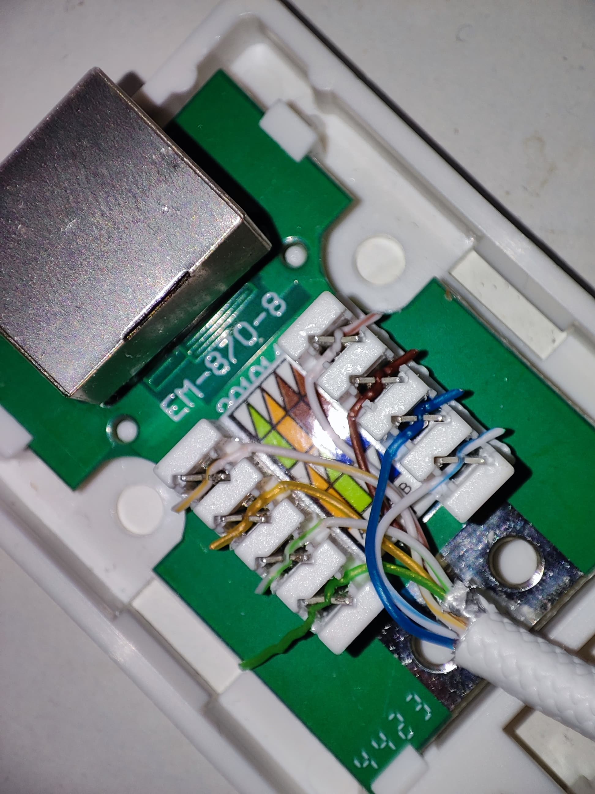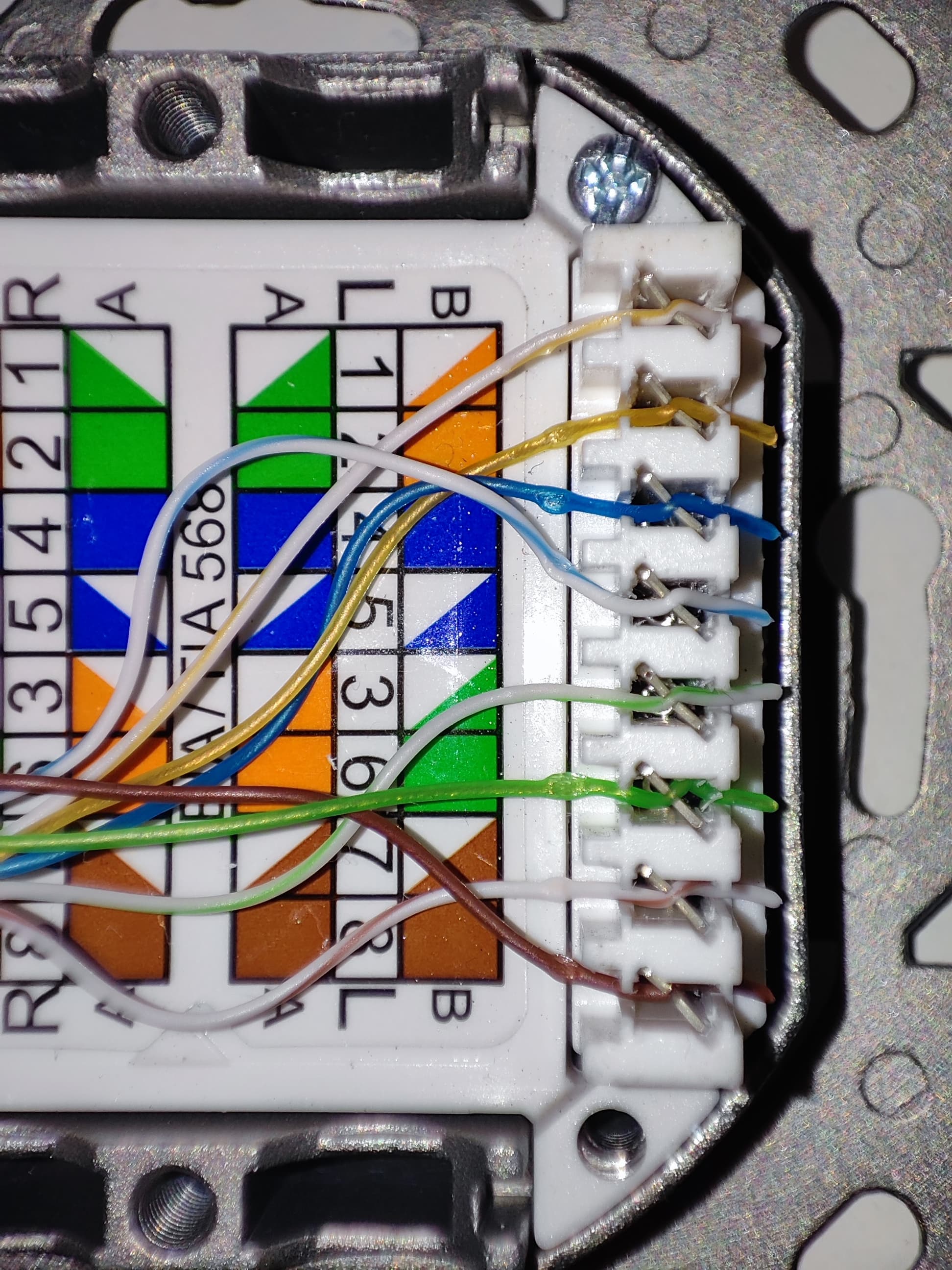 ich bin gerade dabei, ein LAN-Kabel durch ein Leerrohr vom EG zum UG zu ziehen. Jetzt habe ich die beiden Enden jeweils mit einer Dose verdrahtet, bekomme aber keinen Link, wenn ich einen Client anstecke. Also bin ich auf die Fehlersuche gegangen: