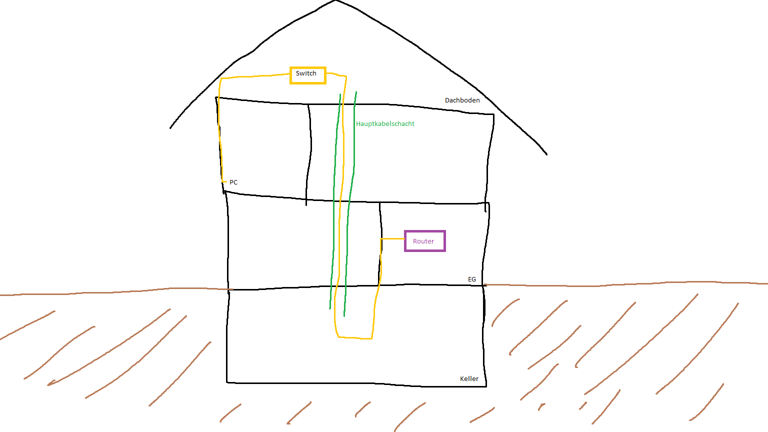 ich habe diesen Thread erstellt, weil ich mir ein LAN-Kabel ins Zimmer legen möchte und ein paar Fragen dazu habe. Leider ist es in unserem Haus nicht einfach so möglich, die Verlegung „traditionell“ mit Patchpanel etc. durchzuführen. Ich habe eine kleine Skizze angefertigt, die dabei helfen soll, die Problematik zu visualisieren. Das LAN-Kabel soll vom Router, der sich im Erdgeschoss befindet ausgehen, dann über ein Leerrohr in den Keller führen, dann über den Hauptkabelschacht im Haus in den Dachboden führen und dann in mein Zimmer führen. Unter Absprache mit einem Elektriker ist eine andere Kabelführung in diesem Fall nicht möglich.