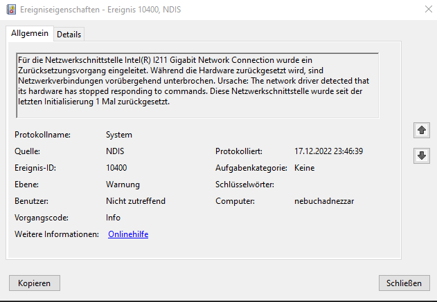 Die Netzwerkkarte (Nicht das WLAN! Das ist aus) vom Mobo deaktiviert sich random, siehe Anhang.