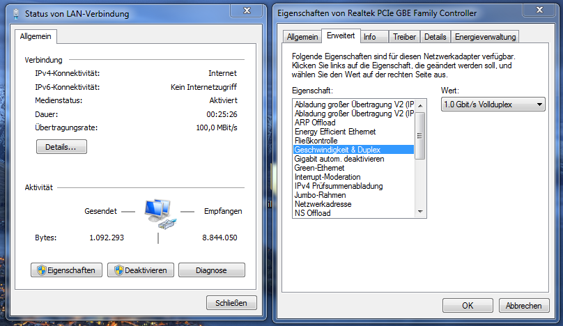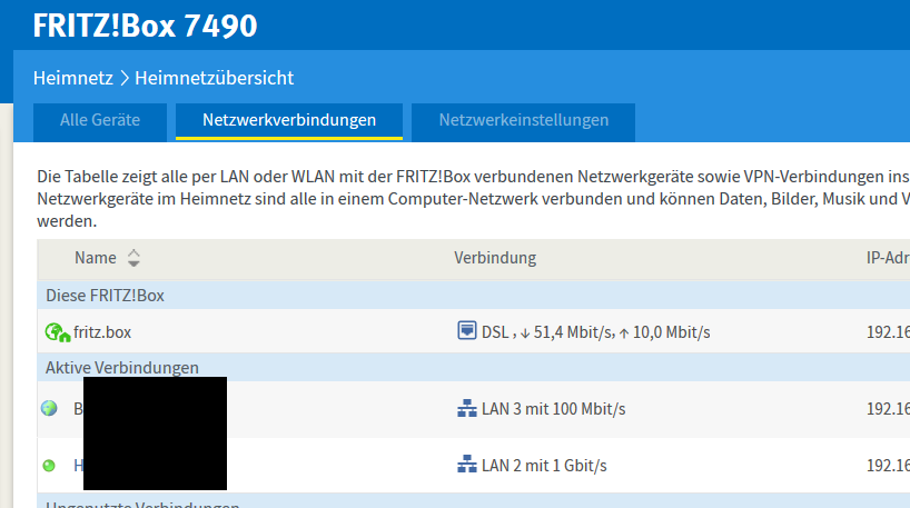 das neu angeschaffte NAS hängt mit 1 Gibt/s an der Fritzbox 7490. Mein Rechner allerdings nur mit 100 Mbit/s, obwohl er die 1 Gbit/s packen sollte. Meine Konfiguration: