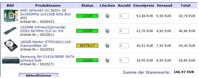 ich spiele mit der Idee mir mit meinen restlichen Komponenten (AMD 64 3000+S.939, einer 66GT und ein Netzteil ) einen kleinen Lanparty-Rechner zusammenzubauen. Ich bräuchte also noch eine FP (80 GB reichen), RAM, ein Motherboard, ein DVD-Laufwerk, einen CPU Lüfter. Gehäuse dürfte hier noch eins rumstehen . Sound und Lan onboard sollten reichen.