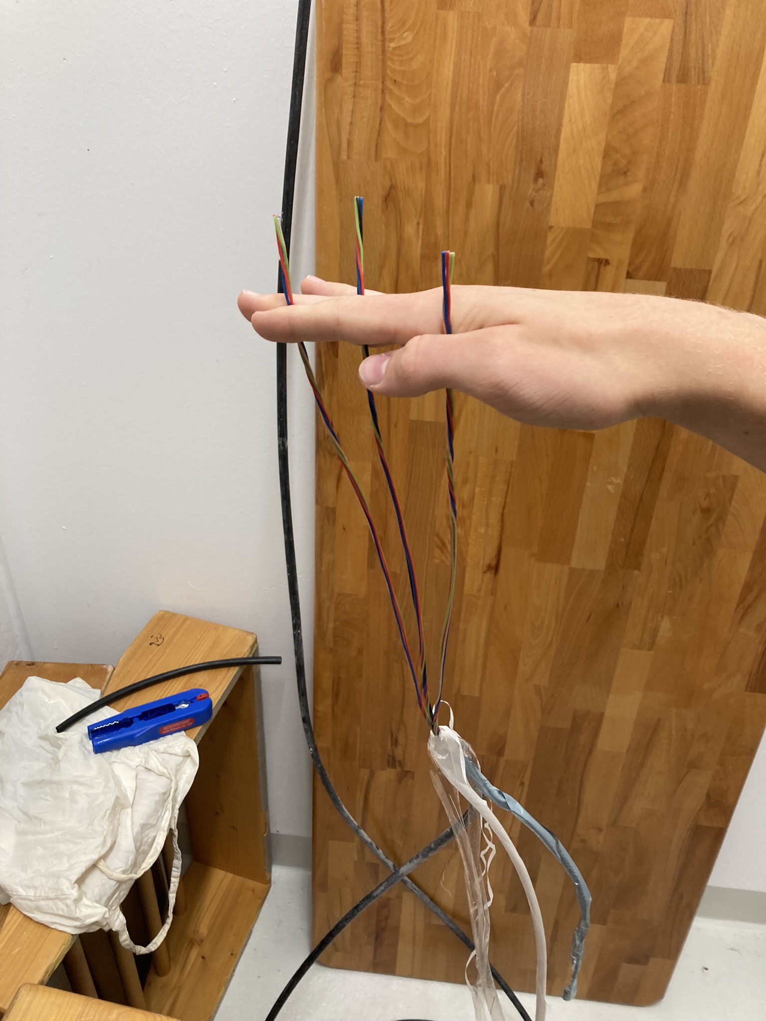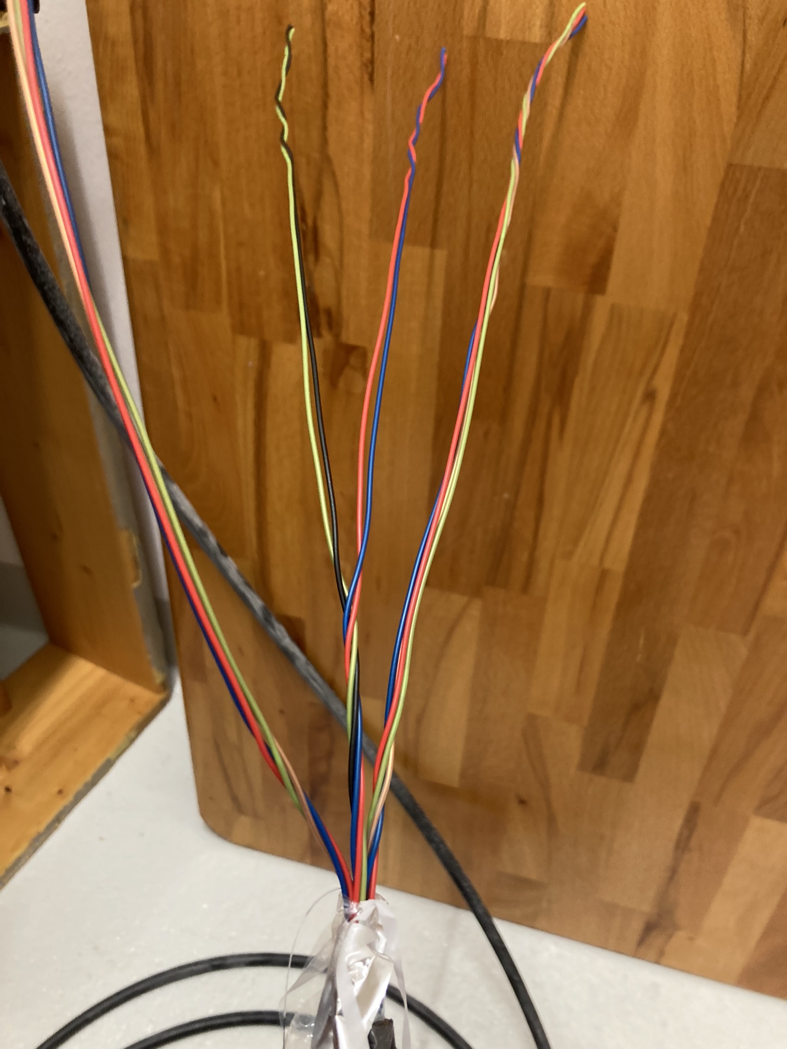 Ich werde als Nächstes die Adern in beiden Häusern identifizieren (wobei ein 4er Strang eh schon durch die einzige schwarze Ader gekennzeichnet ist) und die Adern in den Dosen auflegen (logischerweise immer die verdrehten als zusammengehörige Paare)