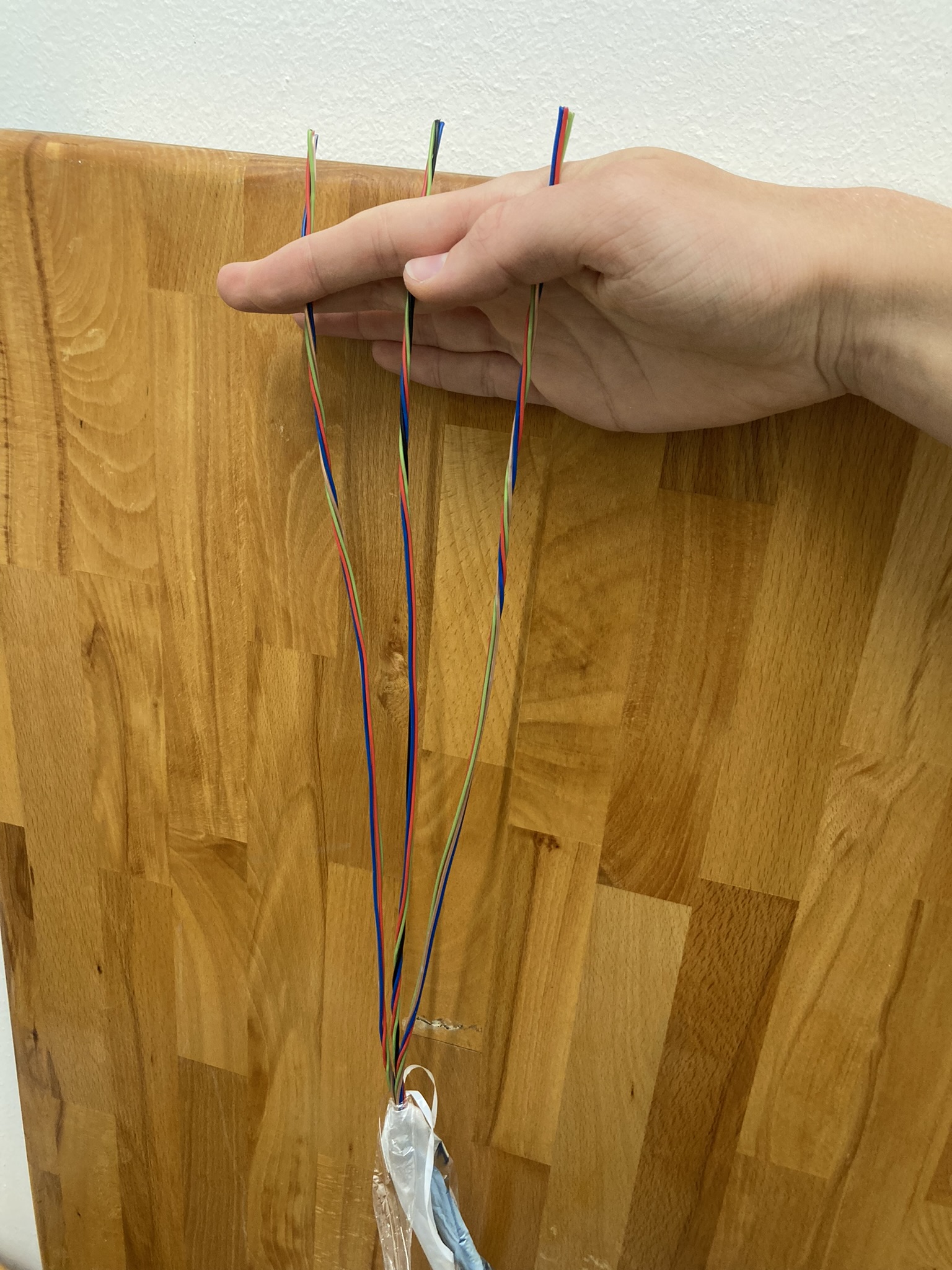 Dann möchte ich mal dieses Thema wieder aufmachen. Ich habe das Kabel länger abisoliert und es hat sich herausgestellt, dass tatsächlich 3 mal vier Adern miteinander verdrillt sind (zwar nicht sehr gleichmäßig, aber doch), von denen je zwei nochmals zu zweier-paaren verdrillt sind (Blau-Rot und Grün-durchsichtig bzw. Schwarz).