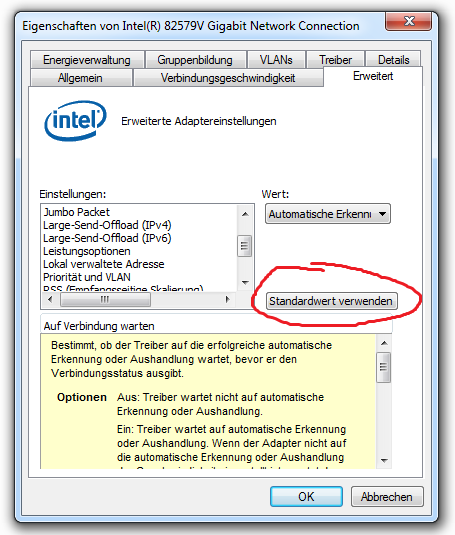 Hmm. Vielleicht was mit dem Treiber oder den Treibereinstellungen. Ich seh gerade, dass es da unmengen an Einstellungen gibt. Kannst du da die Standardwerte wieder setzen? Ich würde da mal ein bisschen rumspielen. Was VLAN anstellt weiß ich aber auch nicht...