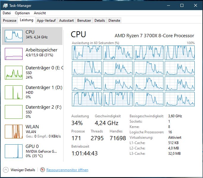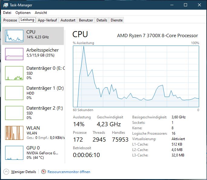 Da sehe ich nichts ungewöhnliches, bis auf beim start des Managers.Wilhelm14 schrieb:Strg+Shift+Esc, Leistung, Ressourcenmonitor. Kannst du dort erkennen, ob etwas den Rechner belastet?
