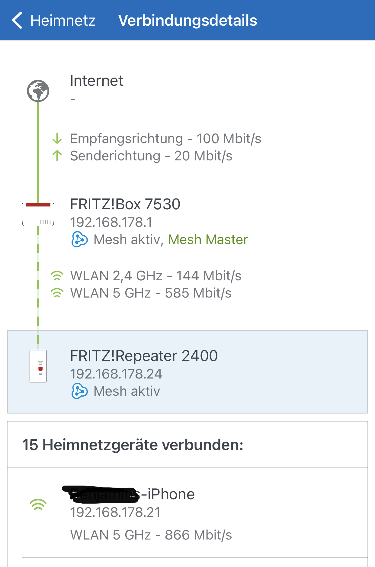 Ich versteh es nicht so ganz voran das liegt. Ich weiß logischweise, dass Repeater die Geschindigkeit "halbieren" da sie ja senden und Empfangen über die selbe verfügbare Bandbreite, aber so wie ich das sehe ist genügend Bandbreite verfügbar um die 100 Mbit Download übertragen zu können...