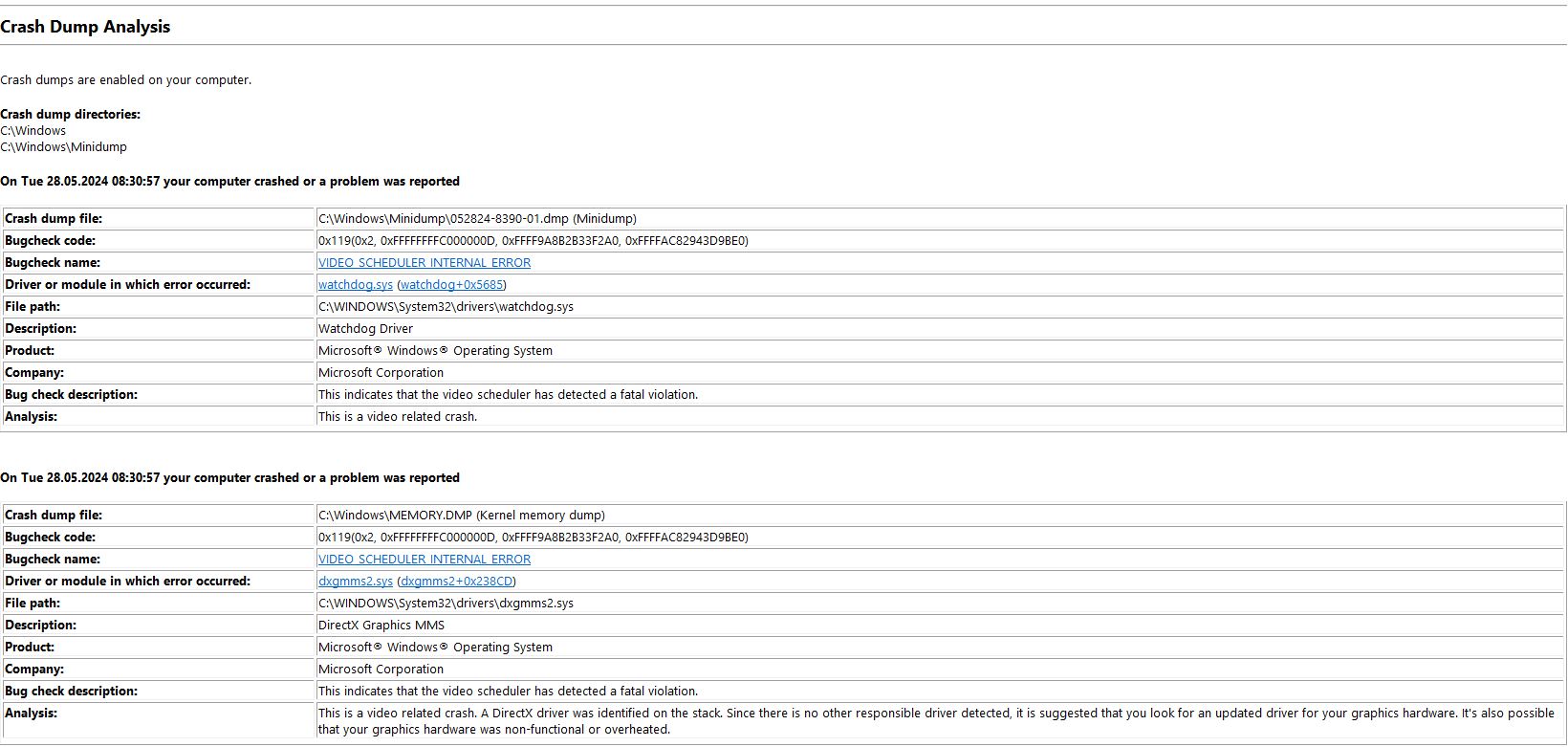 Das zweite Problem ist das Aufwachen aus dem StandBy. In ungefähr 20% der Fälle gibt es ein Bluescreen und das System startet neu. Die Bluescreenanalyse zeigt, dass zu diesem Zeitpunkt der Grafikkartentreiber nicht geladen werden konnte.