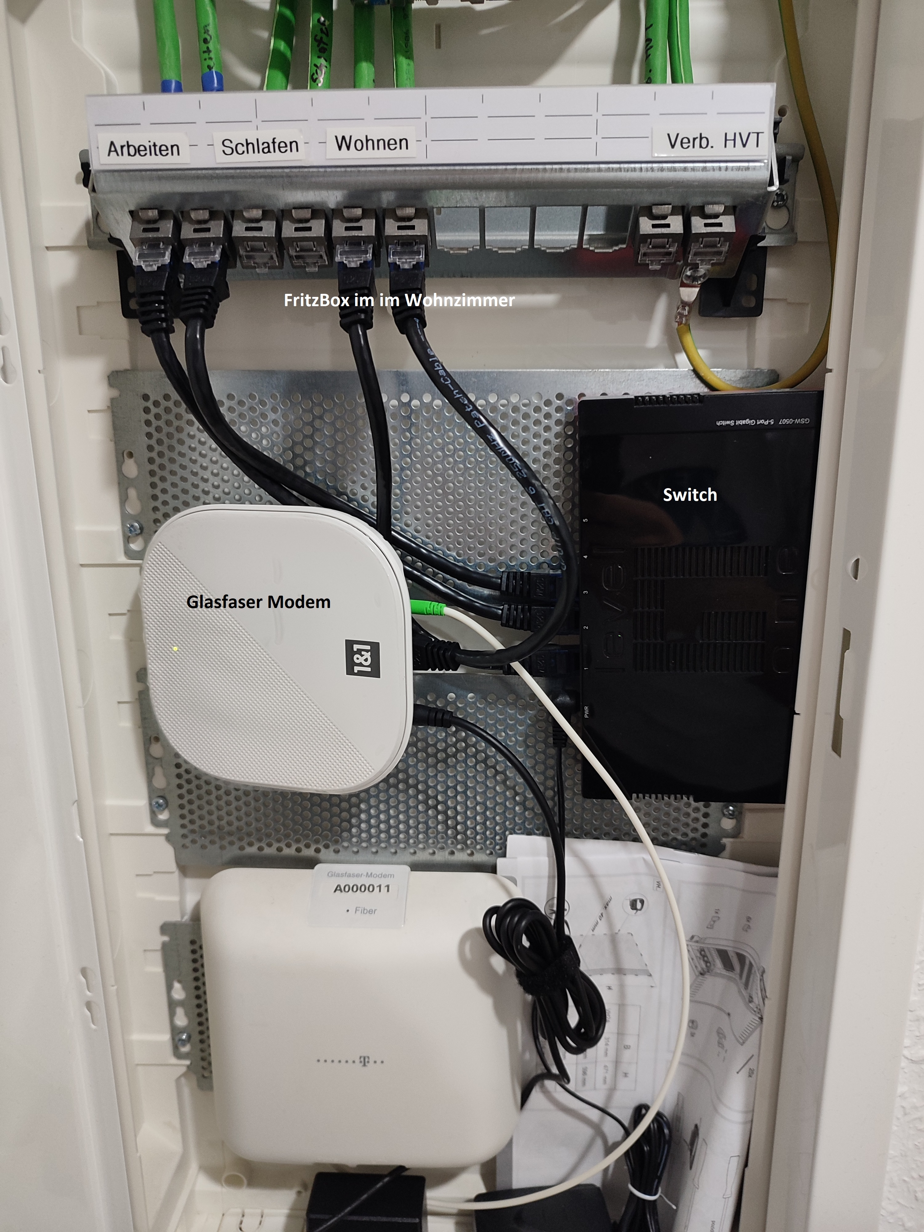 So einen schönen Medienverteiler habe ich leider nicht. Leider geht das Glasfaserkabel direkt in den Router, wodurch ich dieses ja durch ein Leerrohr ziehen lassen müsste, die Leerrohre aber anscheinend belegt wären (obwohl ich dem Techniker nicht so ganz getraut habe, der war recht unmotiviert und so)…ChAiN SaW schrieb:So wie ich das sehe ist der Genexis F500 ein handelsüblicher WLAN Router mit LAN Anschlüssen. Heißt du kannst die Box auch einfach ins Wohnzimmer stellen und von dem Telekommodem aus mit LAN an den Genexis gehen. Ob dazwischen noch Patchdosen kommen ist dabei egal. Somit kannst du dir das Geld für ein Zusatzgerät sparen. Anbei mal ein Bild von meinem Anschluss. Das Schwarze ist ein Switch den kannst du ignorieren. Wichtig ist die Verbindung von 1und1 ins Wohnzimmer. Das 1und1 Modem war bis vor zwei Wochen noch von der Telekom, bin wegen dem Preis dann zu 1und1 gewechselt.