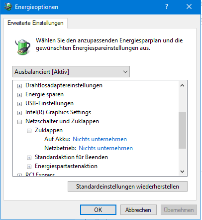 Das Problem ist, selbst wenn ich bei Windows auf Energiesparen klicke, geht der Laptop nicht aus, d.h. es muss irgendwo anders eine Einstellung geben, vllt. in der Registry oder so?