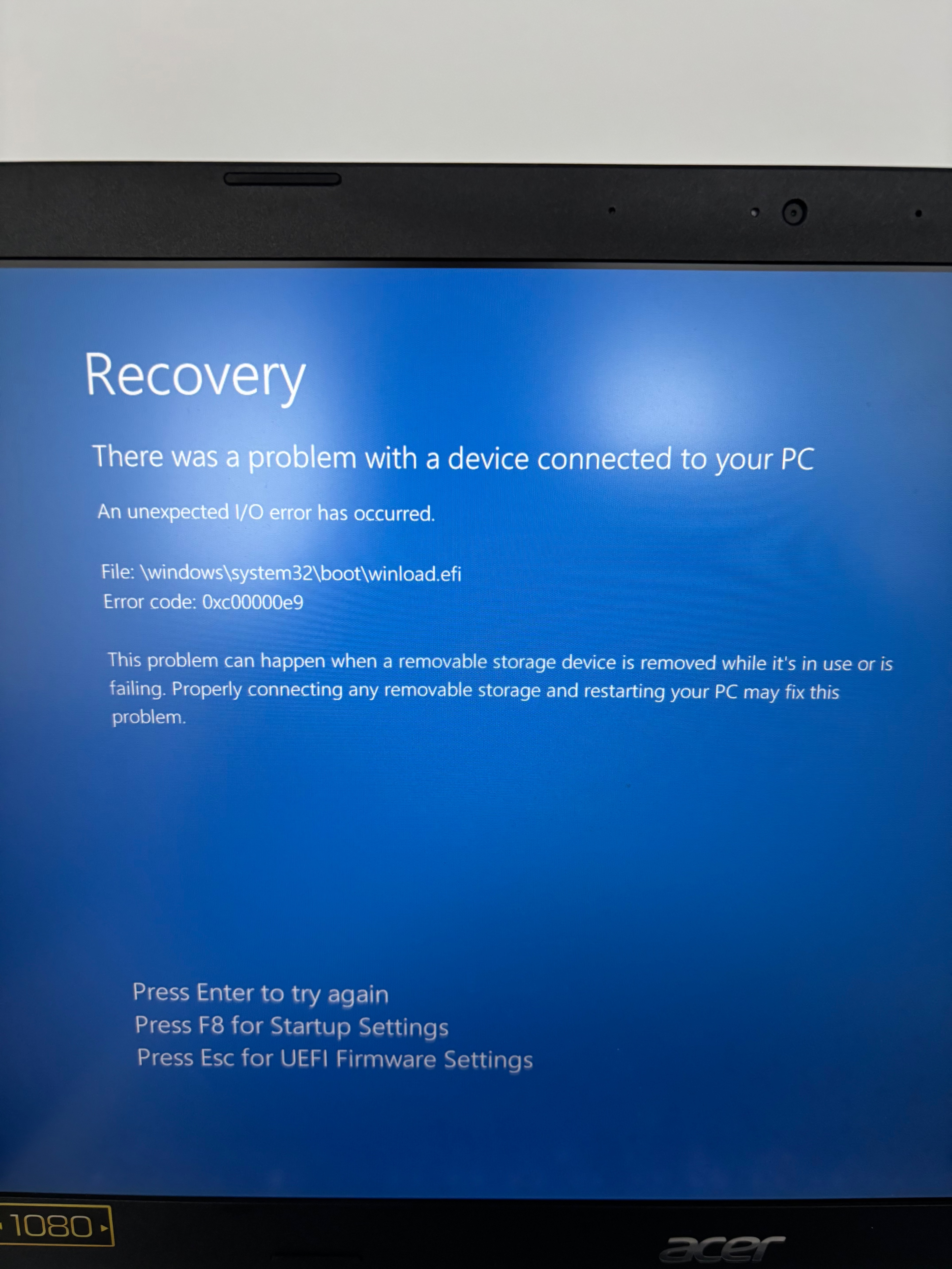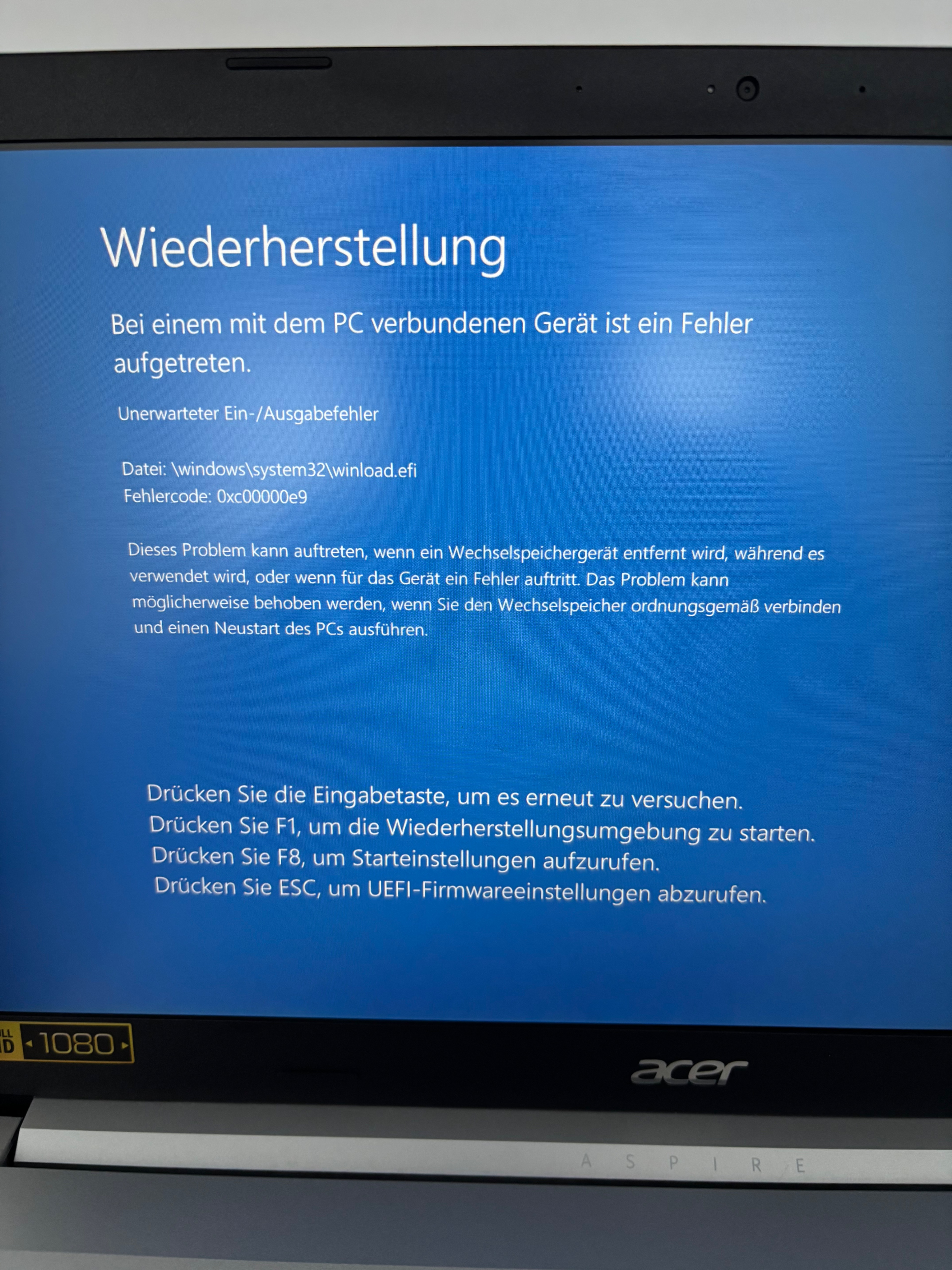 ich habe hier gerade den Laptop meines Vaters bekommen, der offenbar plötzlich nicht mehr booted. Es wird, wenn der Laptop eingeschaltet wird, erst das Acer-Logo angezeigt mit dem Text „Automatische Reparatur wird vorbereitet“. Danach kommt sofort ein blauer Bildschirm (siehe Foto).