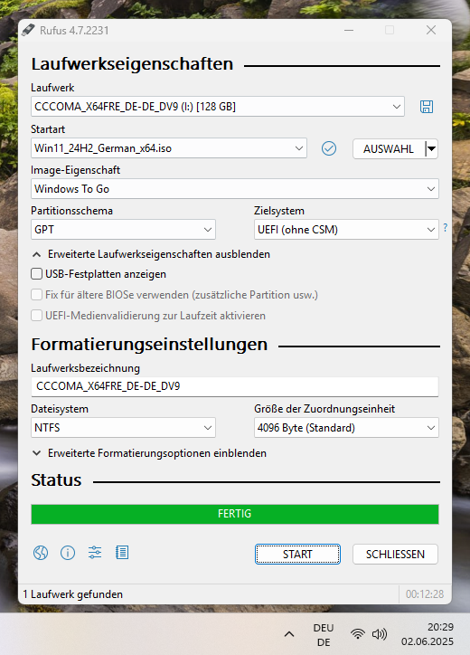 Ändert sich etwas, wenn Du vom Windows-To-Go-Stick bootest und vorher die interne SSD ausbaust?