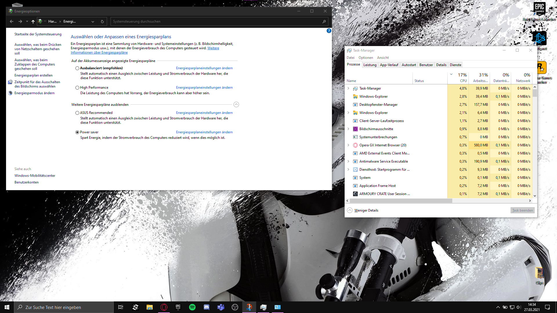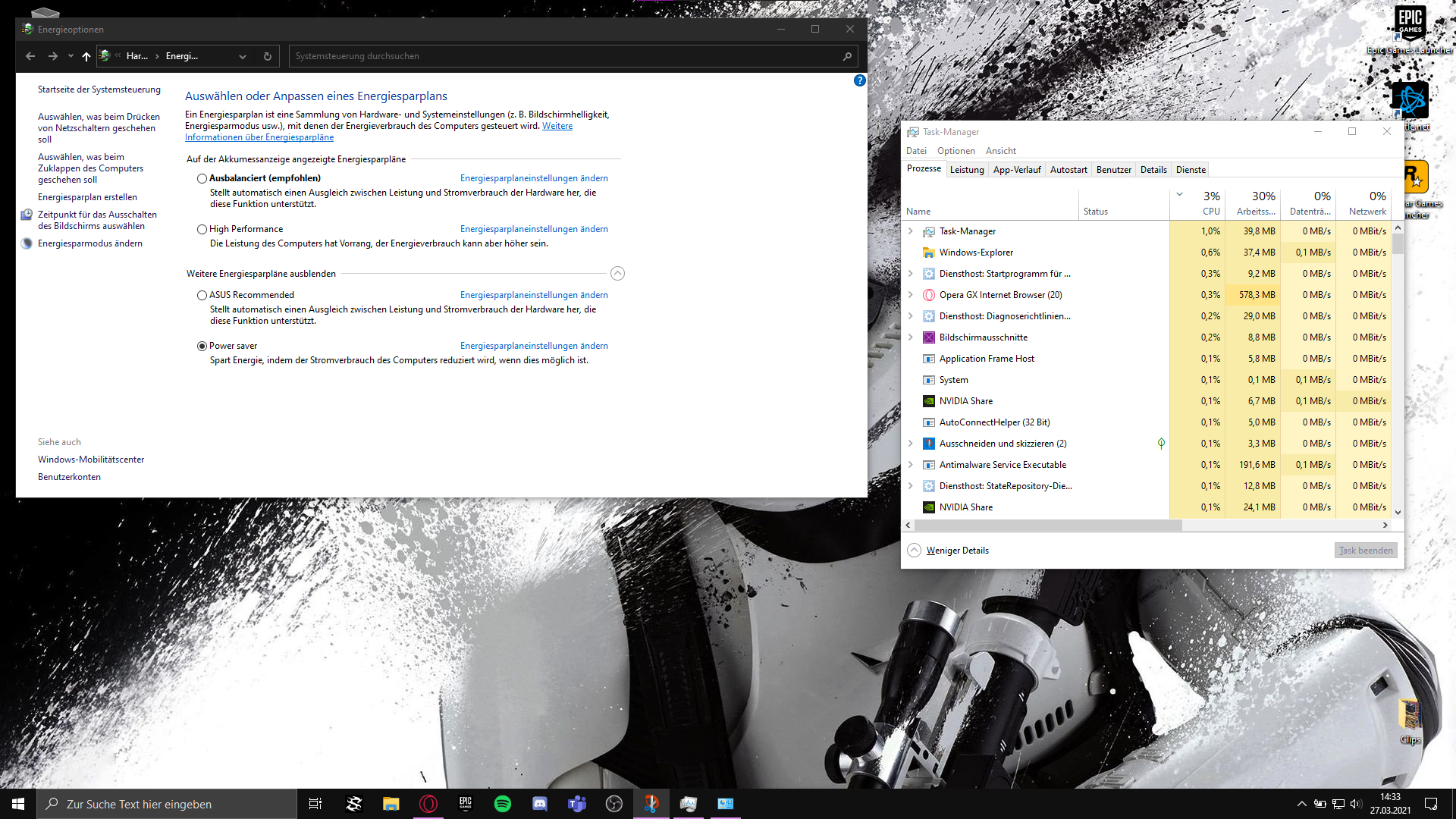 Wenn ich den Laptop anschalte, und wie man im Anhang sehen kann, dann laufen die Lüfter selbst im Energiesparplan power saver. Wenn ich dann z.B,. einfach nur Windowstaste drücke oder meine Maus bewege, dann geht die Auslastung schon zu hoch, dafür dass ich noch nicht einmal ein Programm am laufen habe.