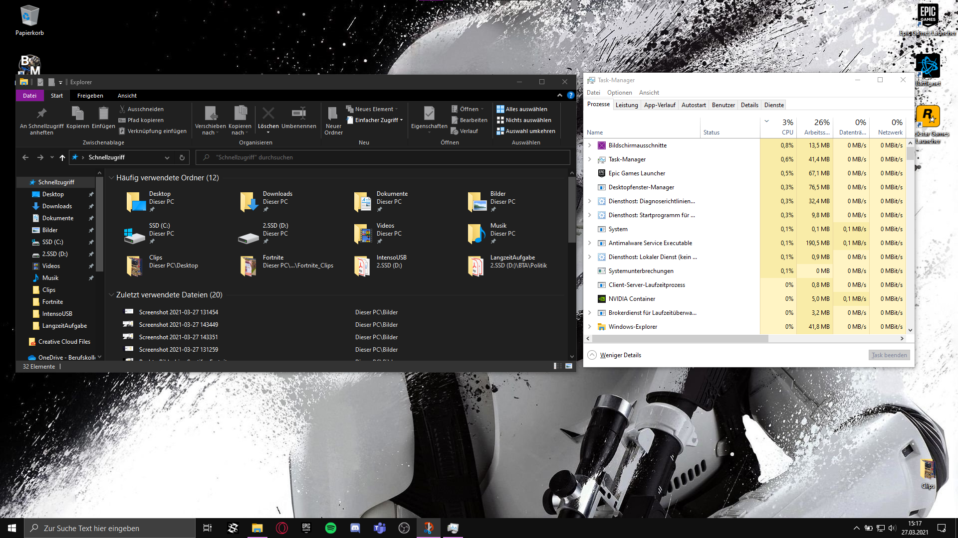 1.Bild: auf dem Laptop-Bildschirm ist Task-Manager offen, und rechts Fortnite und darüber Spotify.