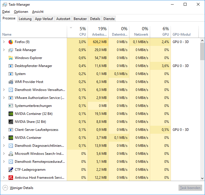 Im folgenden Modi zeigt mir der Taskmanager folgende Auslastung an (keine Anwendungen geöffnet):
