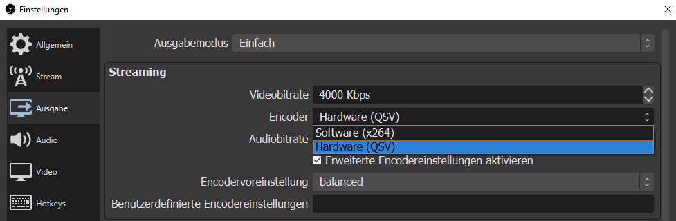 Vielen Dank für den Hinweis! Meinst Du mit Quicksync den Hardware-Encoder? Bei mir heißt die Einstellung "Hardware (QSV)".
