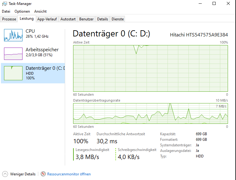 Problem ist relativ klar: WIN 10 mit 4 GB --> Festplatte ist bei nahezu jeder Aktion bei 100% Auslastung.