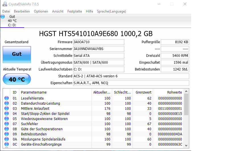 Festplatte: HGST HTS541010A9E680 mit 1 TB unterteilt in zwei Partitionen