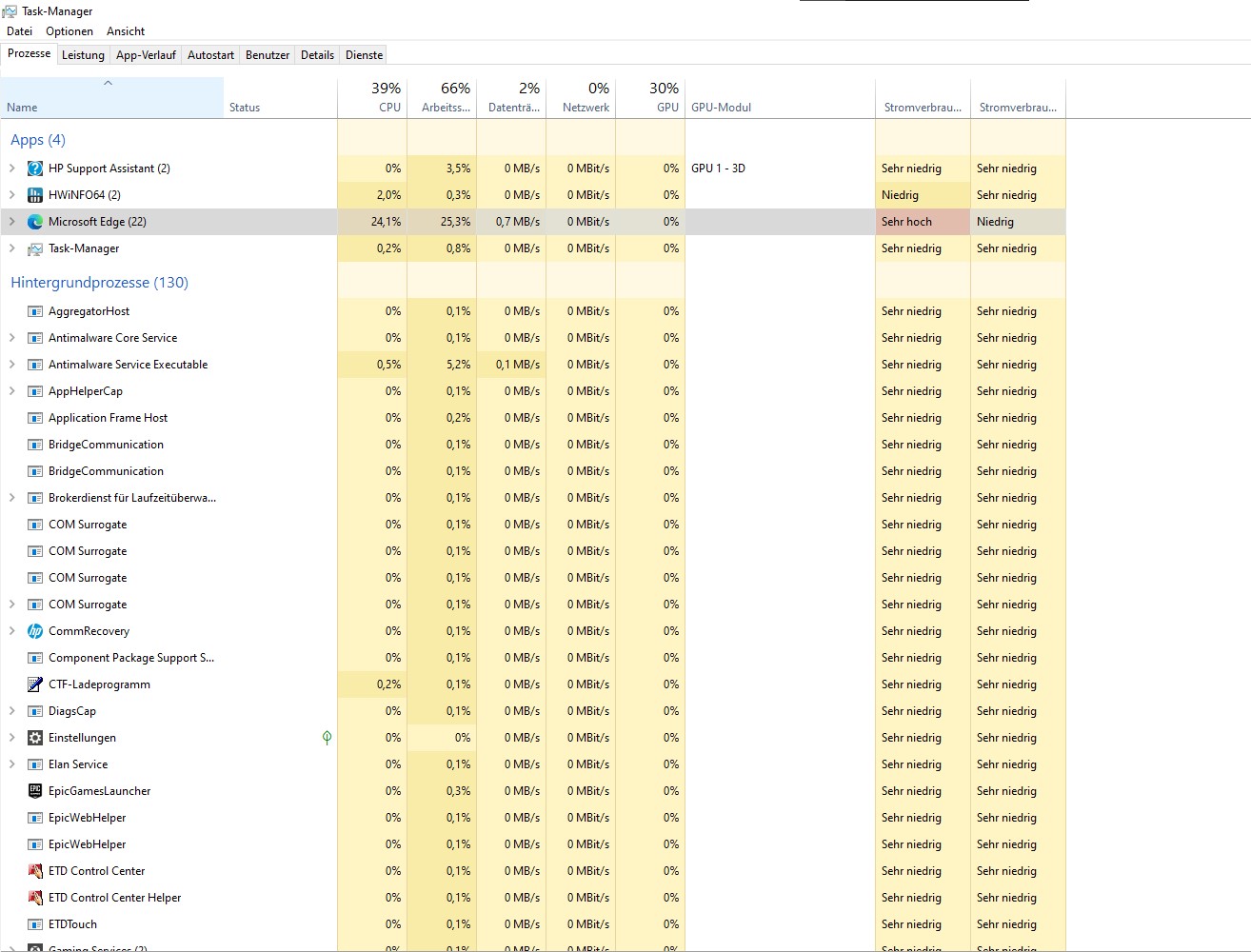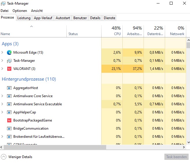 Valorant schluckt 37%, Edge 9,9%, Rest sehen wir nicht wirklich. Du musst durch Klick auf das entsprechende Tab nach Auslastung sortieren, um wirklich alle großen RAM-Schlucker zu sehen.